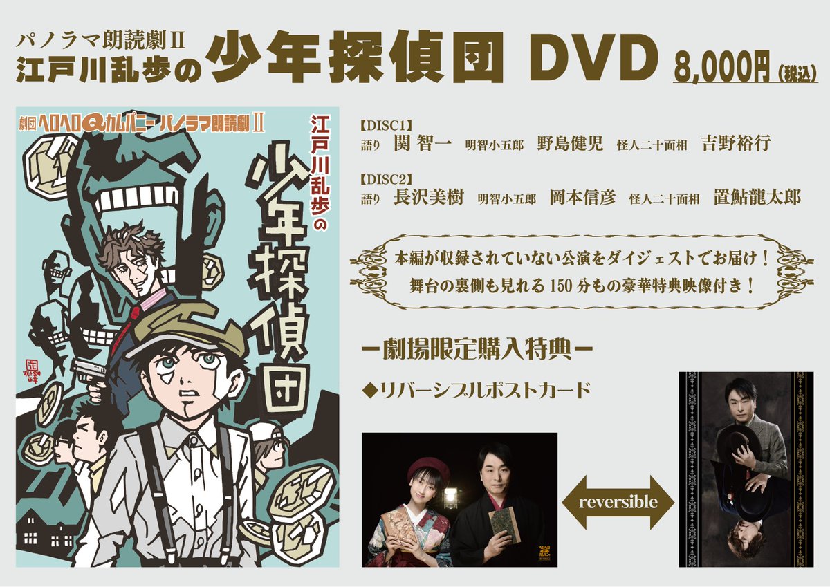 【ヘロQショップよりお知らせ】 ●『パノラマ朗読劇Ⅱ江戸川乱歩の少年探偵団』DVD 大好評発売中! 劇場ロビーにて公開しておりましたPVをお届けします! DVDの魅力をぎゅぎゅっと詰め込んだ映像をお楽しみください♪ また、スマホ版をより見やすくリニューアルいたしました! よろしくお願いいたします! ヘロQショップ→