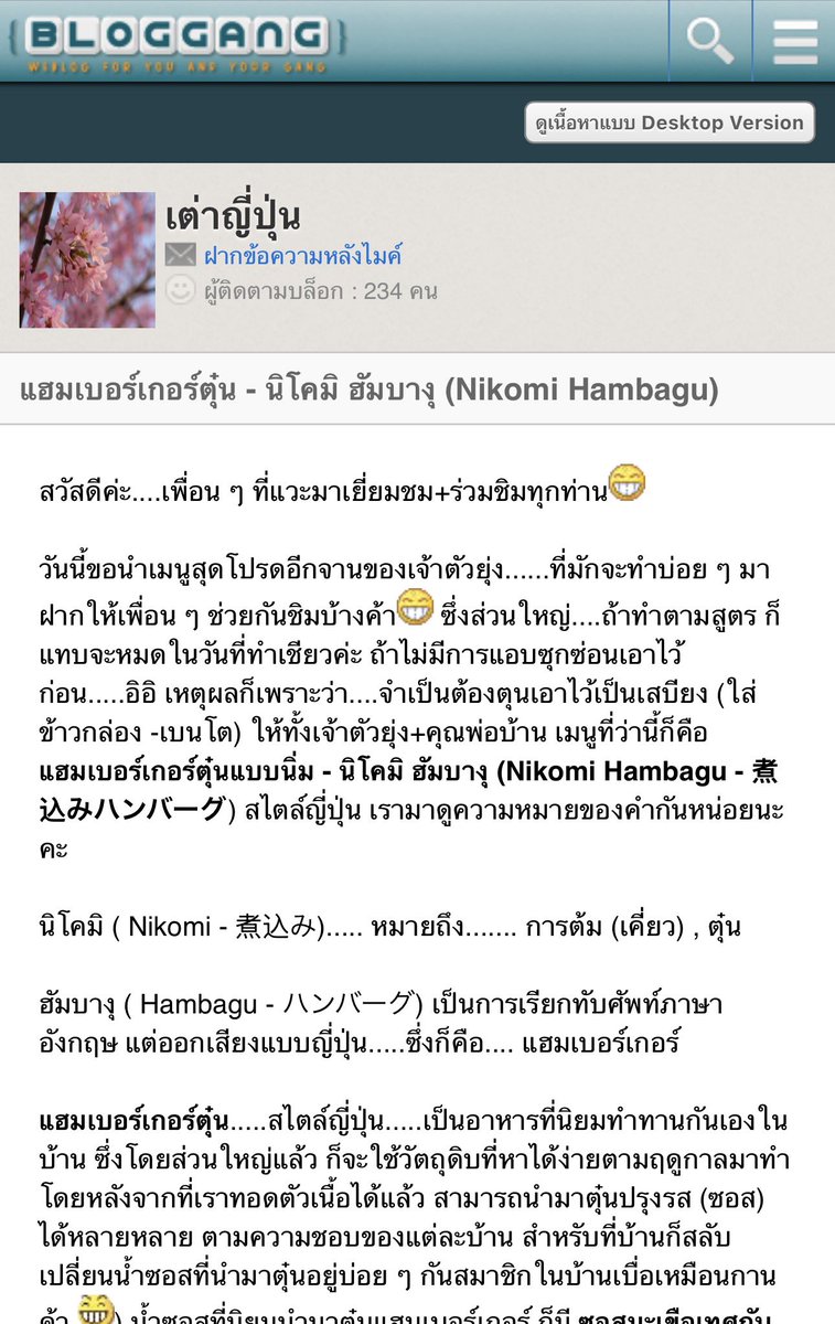 แฮมเบิร์กตุ๋น Nikomi Hambagu สูตรจากคุณเต่าญี่ปุ่น มันออกแนว มีทบอลซอส แต่เป็นญี่ปุ่นสไตล์ ซอสมีคงามสดชื่นของมะเขือเทศและซอสเปรี้ยว เนื้อบดผสมหมู ใส่หอมใหญ่ ไข่ กระเทียม เกลือ โชยุ เกล็ดขนมปัง (ไข่ เกล็ดขนมปัง จะทำให้เนื้อไม่แห้ง ชุ่มฉ่ำมากขึ้น/สำคัญ) เนื้ออย่าปรุงเค็มมาก เดี๋ยวมีซอสอีก รสอ่อนไว้ก่อน หมักไว้ ระหว่างหมัก มาทำซอส ซอสเราไม่ได้ทำตามขั้นตอนคุณเต่า แต่ออกมาน่าจะคล้าย (ต่างแค่วิธี) ใส่เห็ดแชมผัดเนย (ใจเย็น เห็นต้องผัดไฟกลางจนน้ำออกนอง แล้วผัดต่อจนน้ำงวดลง เห็ดจะอร่อบหวาน ถ้าใจร้อนไม่รอให้น้ำงวด เห็ดจะขมไม่อร่อย น้ำซอสจะขมด้วย) ใส่แป้งลงไปทำ roux (การผัดแป้งกับเนยจนแป้งสุก) เติมน้ำ ใส่ผงซุปปลา มะเขือเทศ โชยุ ซอสเปรี้ยว เกลือ พริกไทย ไฟกลางคนจนสุก ถ้าแห้งเติมน้ำให้เยอะ เดี๋ยวจะค่อยๆลดไฟเคี่ยวให้เข้าเนื้อ ชิมรสออกเค็มเปรี้ยวหวาน Step ที่เคี่ยวซอส ให้มาทอดเนื้อ ปั้นเป็นก้อน ใส่ในน้ำมันไฟกลาง ใจเย็น ใส่แล้ว ห้ามคนเลย รอจนเนื้อเริ่มสุกด้านนึงก่อน ค่อยๆแซะอย่างเบามือ พลิกกลับ จะเป็นก้อนสวย ถ้าใจร้อน คนตั้งแต่เนื้อด้านนึงยังไม่สุก เนื้อจะแตกไม่เป็นก้อน พอเนื้อเริ่มสุก 2 ด้าน ตักเนื้อใส่ซอส ตุ๋นต่ออีก 15-20 นาที ใส่จานราดบนข้าวสวย กินอร่อยมาก ช่วงนี้เห่อใช้ใบหูเสือมาก (Maxican mint) ที่บ้านมีเยอะ รูปร่างเหมือนใบงาเกาหลี แต่กลิ่นฟุ้งมากคล้าย ออริกาโน่ คนเมืองกินกับลาบ นี่ชอบเอามาใส่อาหาร กลิ่นคล้ายออริกาโน่จริงๆ จานนี้ก็ใส่