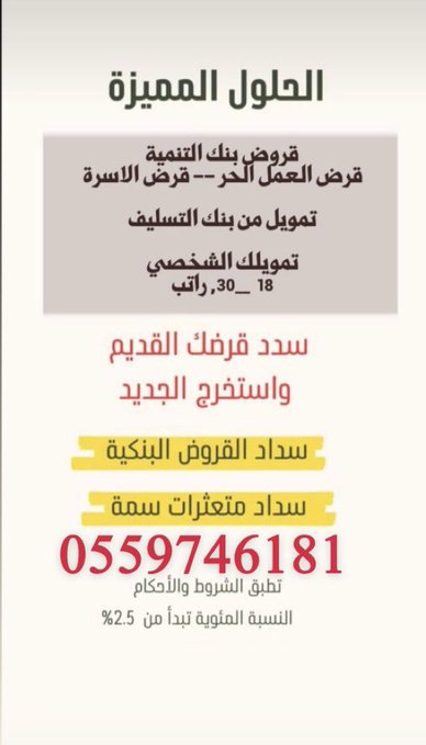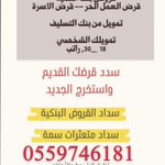 •• 💰💢 استخراج قروض شخصية 👍👤قطاع حكومي او خاص ومن ع وشك تقاعد 🏦☄️استخراج قروض مؤسسات على نقاط البيع 💰😍تقسيط مبالغ ميسرة للسعوديين والغير سعوديين ابو مشاري 0559746181