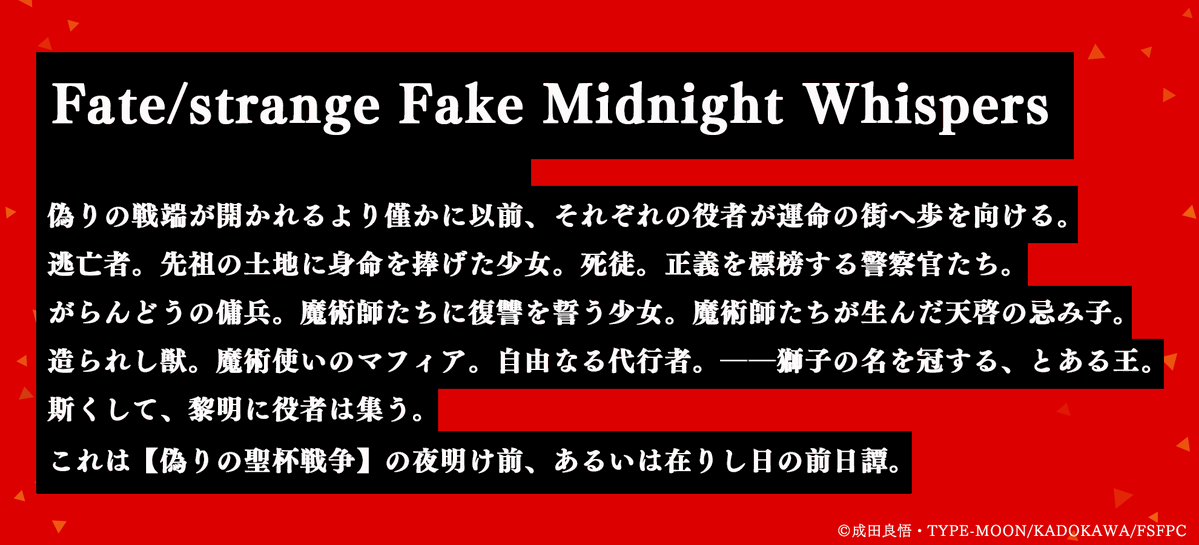 ◤ Fate/strange Fake Blu-ray Disc Box 特典小説◢ 成田良悟先生書き下ろし 『Fate/strange Fake Midnight Whispers』 本編の”前日譚”が描かれる本小説は、 完全生産限定版・特製ブックレットに収録されます。