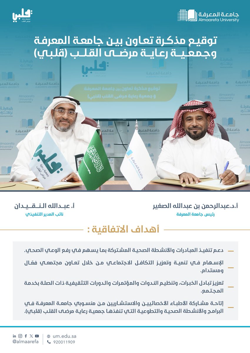 في إطار تعزيز التعاون المجتمعي، وقعت #جامعة_المعرفة مذكرة تعاون مع جمعية قلبي لتنمية التكافل الاجتماعي عبر مبادرات مشتركة تسهم في خدمة المجتمع، وتحقق أثر مستدام.