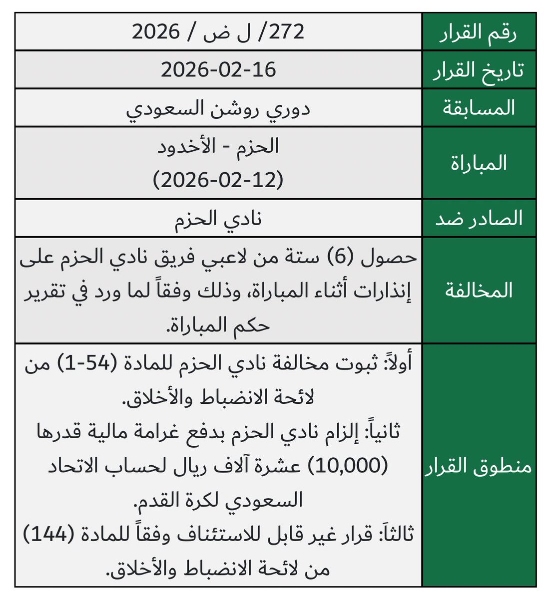 تاريخ قرار لجنة الانضباط والأخلاق: 2026-02-16