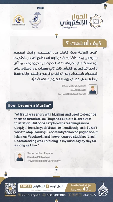 بفضلِ الله، أعلنَت عاملةٌ فلبينية إسلامها عبر جوال العناية بالجاليات، يوم أمس الإثنين الموافق 26-05-1447هـ