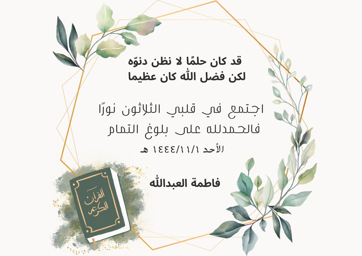 {ثُمَّ أَوْرَثْنَا الْكِتَابَ الَّذِينَ اصْطَفَيْنَا مِنْ عِبَادِنَا} هذا فضل الله❤️ اللهم لك الحمد كما ينبغي لجلال وجهك و عظيم سلطانك. من بعد مسيرة دامت الثلاث سنوات.. أتممت حفظ كتاب الله عزّ وجل، جعله الله نورًا في صدري و أنيسي في قبري و شفيعي يوم القيامة.. دعواتكم بالثبات