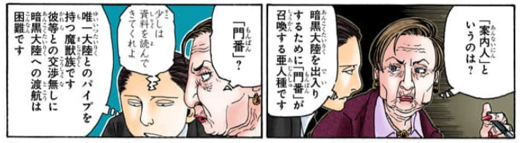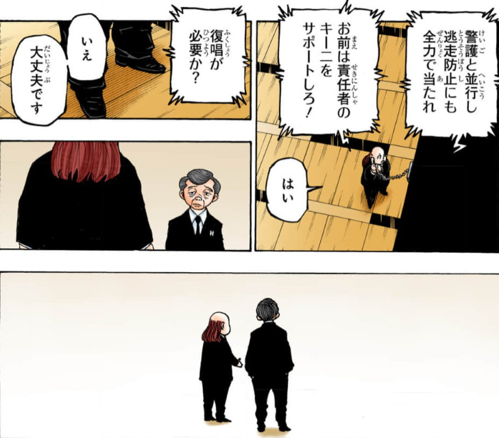 【考察】 前夜祭でビヨンドと同じく左手のみを上げているのがツェリードニヒ、ツベッパ、ハルケンブルグ、カチョウの4人。 そして背後に隠れる構図のオイト=隠し子 を表しており、この5人がビヨンドの隠し子であるという伏線を予感させる。