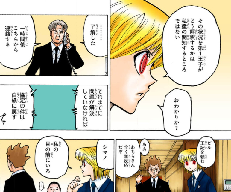 【伏線回収】 最初に数字を言うのはハンターの符丁 →数字の文節を拾え →各文の1.3.4.4番目の文節を繋げて読む →「カチョウフウゲツ両王子の 逃走を 全力で サポートしろ!」 通話は上位王子によって監視されているため、ハンターだけに伝わるよう暗号化されたミザイストムからの極秘指令。