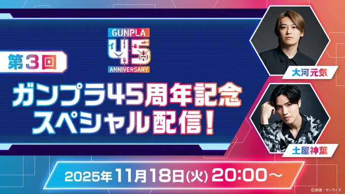 ガンプラ45周年を記念した特別配信番組。第1回、第2回配信に出演いただいた大河元気様に加え新たに土屋神葉さんをゲスト迎え、株式会社BANDAI SPIRITSのガンプラ企画担当者と最新のガンプラ情報を聖地”GUNDAM BASE TOKYO”からお届けします。45周年の展開情報や新商品情報、最新技術の紹介まで、ガ...
