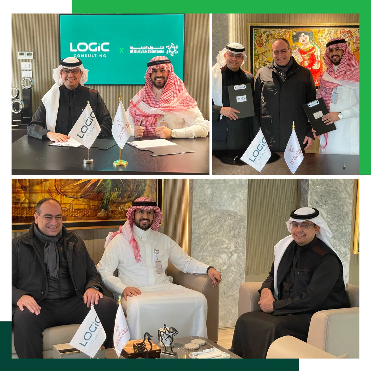 تم توقيع الشراكة بحضور كل من أ/عمرو عثمان, رئيس مجلس إدارة شركة لوجيك القابضة, أ/ عادل الأحمدي, الشريك التنفيذي لشركة لوجيك للاستشارات بالرياض, أ/عبد الله , الرئيس التنفيذي لشركة حلول الدرعية.