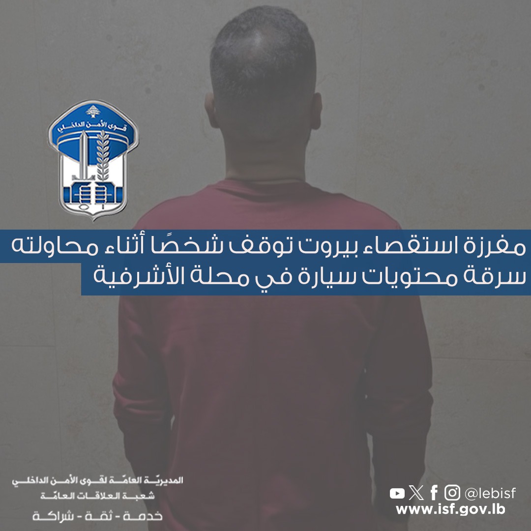 في إطار المتابعة اليوميّة التي تقوم بها قوى الأمن الدّاخلي لمكافحة عمليّات السّرقة في مختلف المناطق اللّبنانية، ولا سيّما السّرقة من داخل السّيّارات المركونة على جانب الطّرقات، توافرت معطيات لدى شعبة المعلومات حول قيام شخص مجهول على متن درّاجة آلية، بتاريخ 2-2-2026، بسرقة مسدّس حربي من داخل سيّارة مركونة في موقف عام في محلّة جلّ الدّيب.