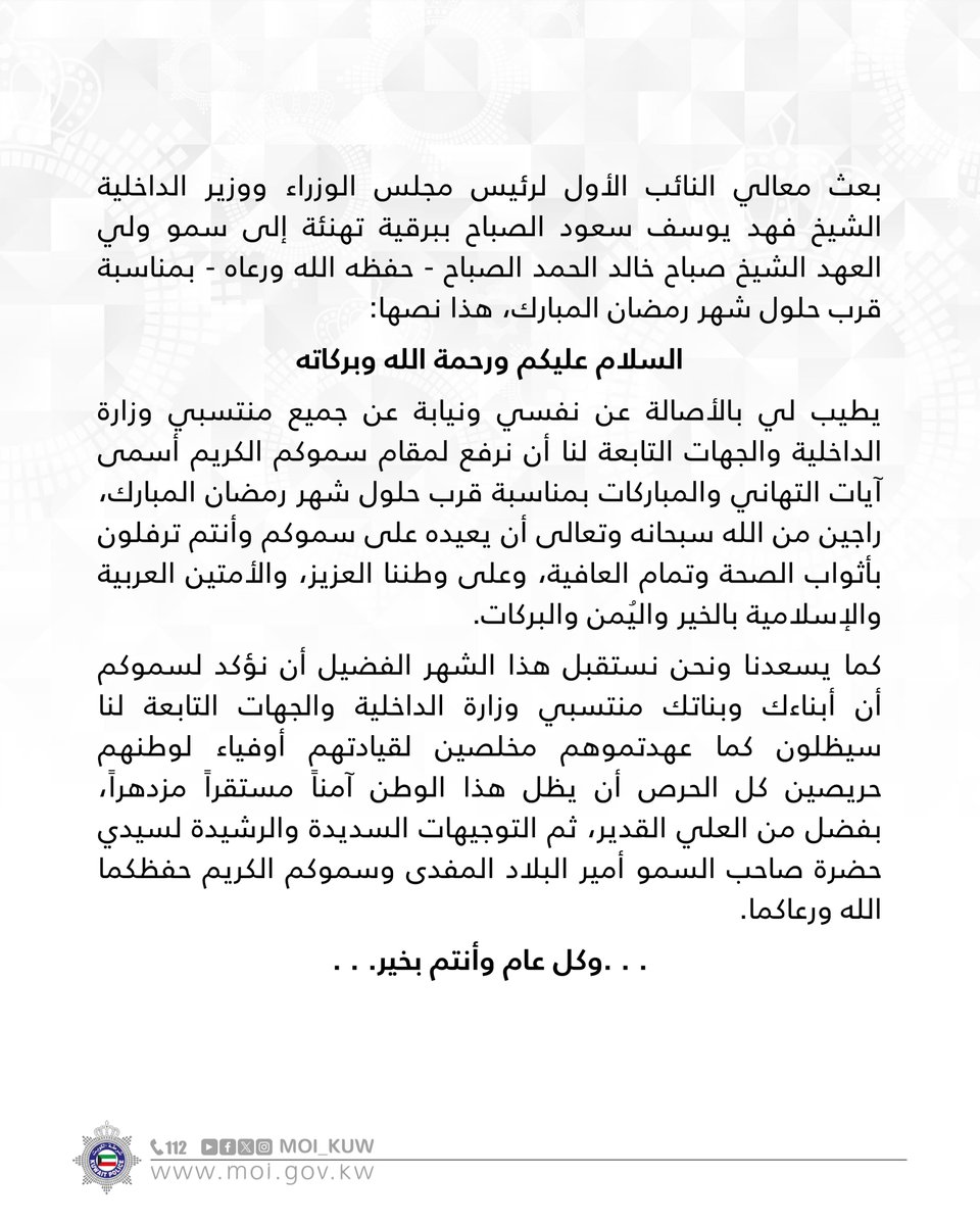 قام معالي النائب الأول لرئيس مجلس الوزراء ووزير الداخلية الشيخ فهد يوسف سعود الصباح بزيارة إلى المؤسسات الإصلاحية، حيث التقى بعدد من النزلاء وشاركهم وجبة الإفطار، وذلك في إطار حرصه على تعزيز التواصل الإنساني ومشاركتهم أجواء شهر رمضان المبارك.