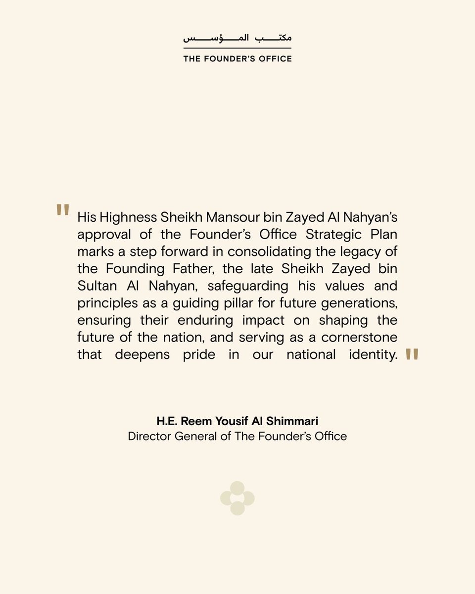 Mansour bin Zayed approves the strategic plan of The Founder’s Office, comprising initiatives to safeguard, document, and activate the legacy of the late Sheikh Zayed. Aligned with national priorities, the strategy emphasizes the role of Sheikh Zayed as a model of leadership and source of national pride, ensuring that his life, values, and principles remain a living source of inspiration for current and future generations.