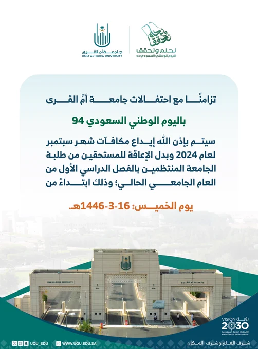 تزامنًا مع احتفالات #جامعة_أم_القرى بـ #اليوم_الوطني_السعودي_94؛ سيتم بإذن الله إيداع مكافآت شهر سبتمبر لعام 2024 وبدل الإعاقة للمستحقين من طلبة الجامعة المنتظمين بالفصل الدراسي الأول من العام الجامعي الحالي؛ وذلك ابتداءً من يوم الخميس: 16-3-1446هـ.