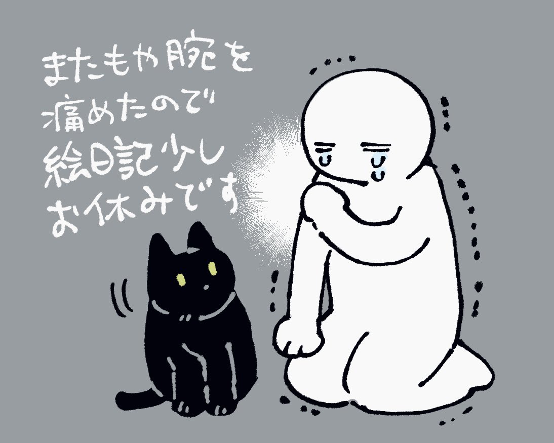 腕負傷により絵日記おやすみです( ᵕ̩̩ㅅᵕ̩̩ ) 前回みたいにおおごとじゃないのでご安心ください、転けて動けなくなってた自分より大きくて重い人間を助け起こしたら肩と肘が爆発してしまっただけですので…