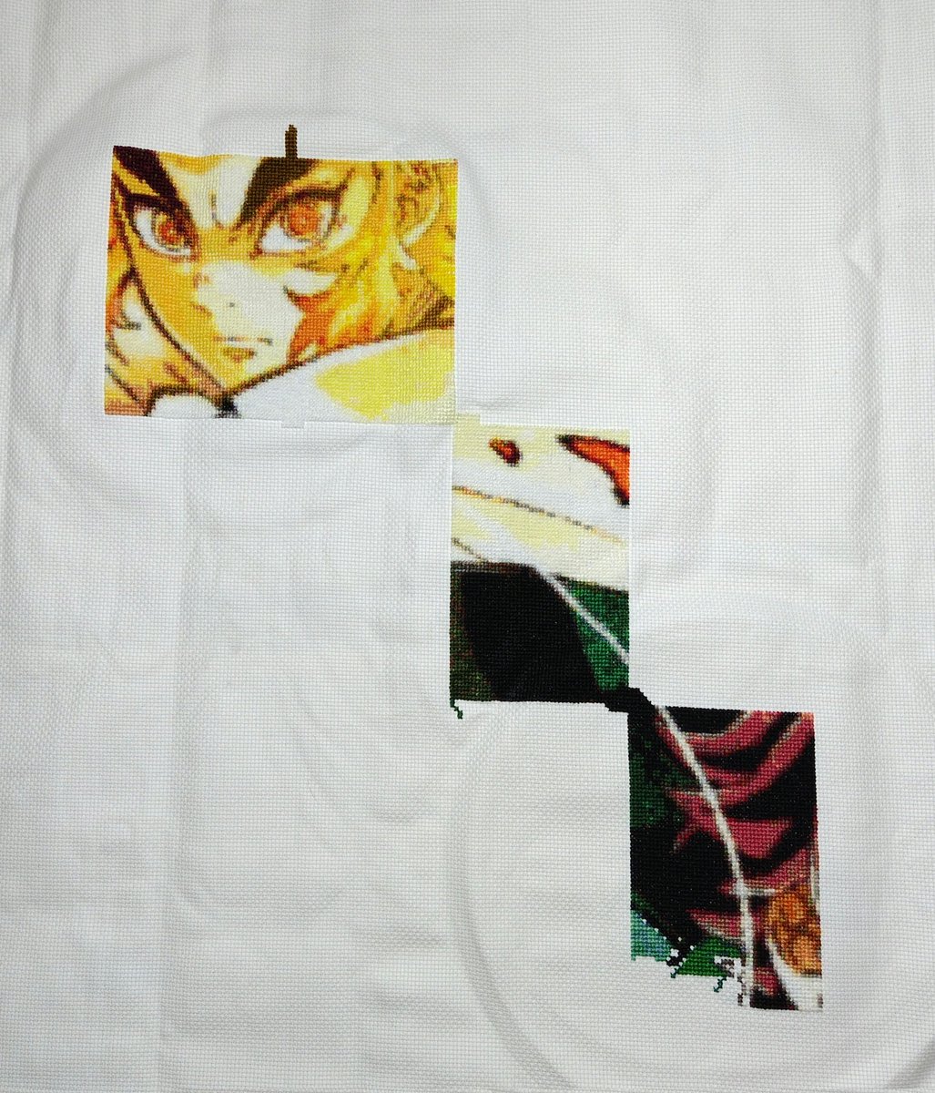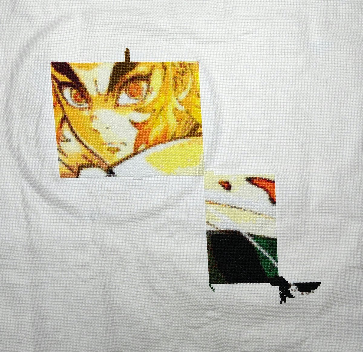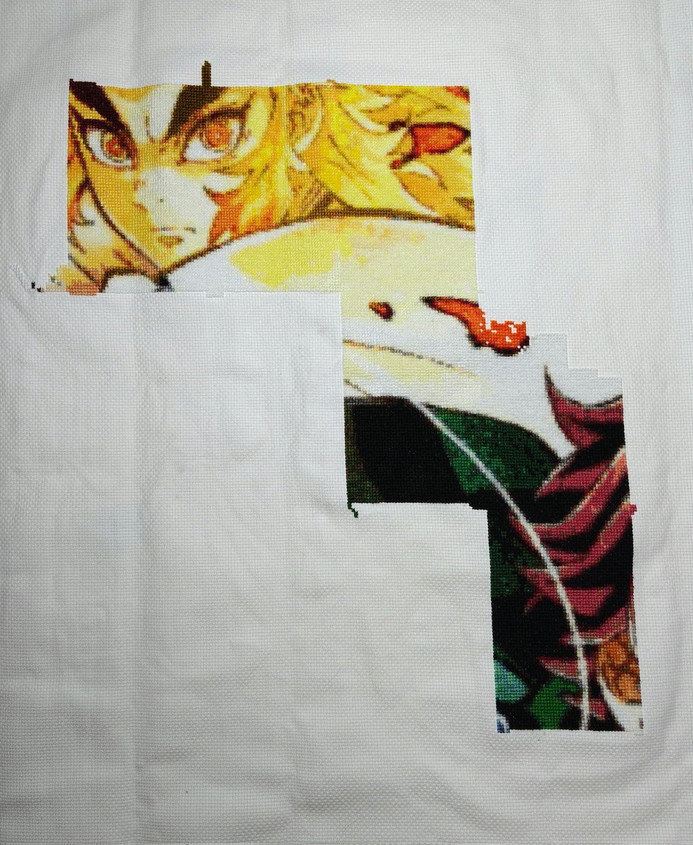 今日はここまで❗️ 鬼滅の刃の煉獄さんをクロスステッチで刺す者です。 あちこち刺し散らかしてますが、炭治郎さんの位置がつかめたので、そろそろ面になるように地続きで刺そうかと思います。