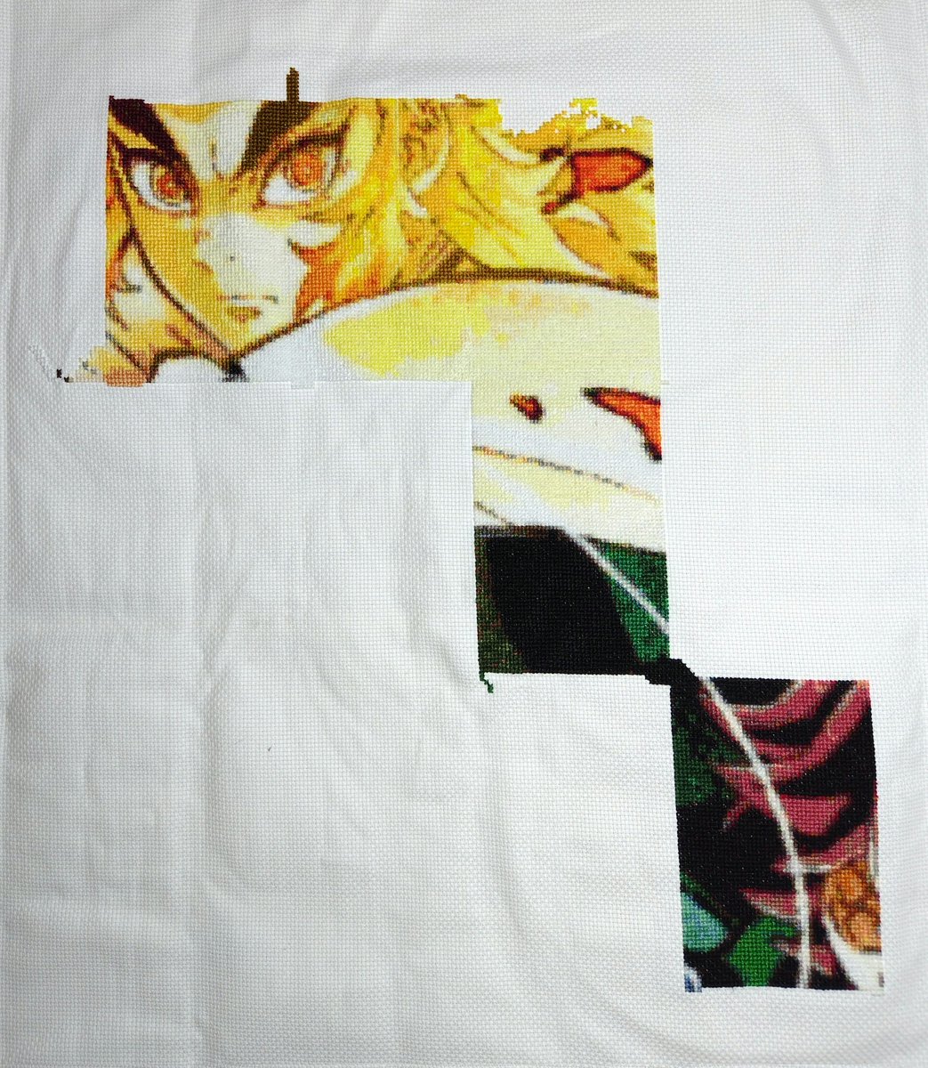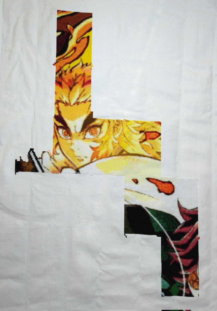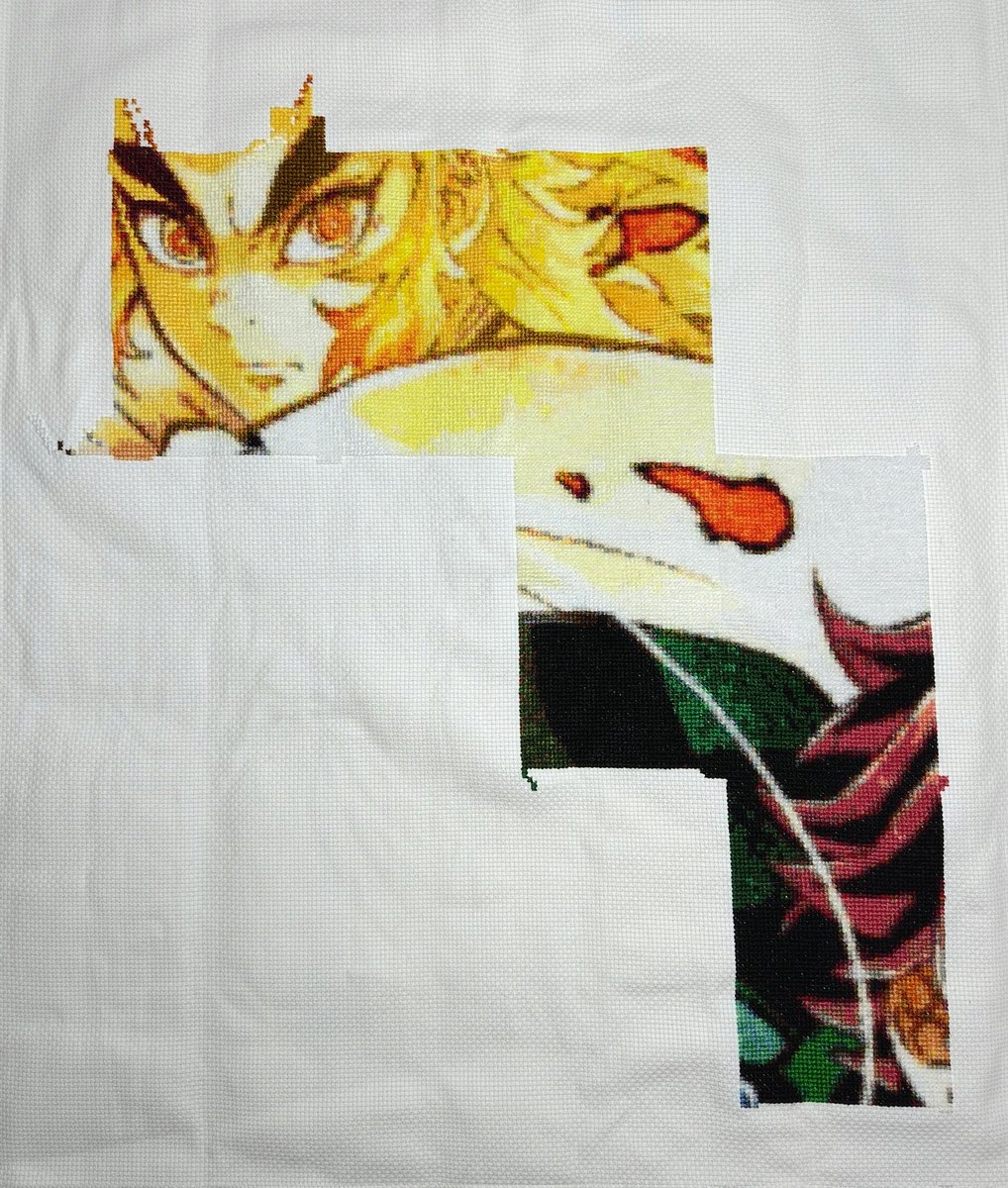 今日はここまで❗️ 鬼滅の刃の煉獄さんをクロスステッチで刺す者です。 あちこち刺し散らかしてますが、炭治郎さんの位置がつかめたので、そろそろ面になるように地続きで刺そうかと思います。