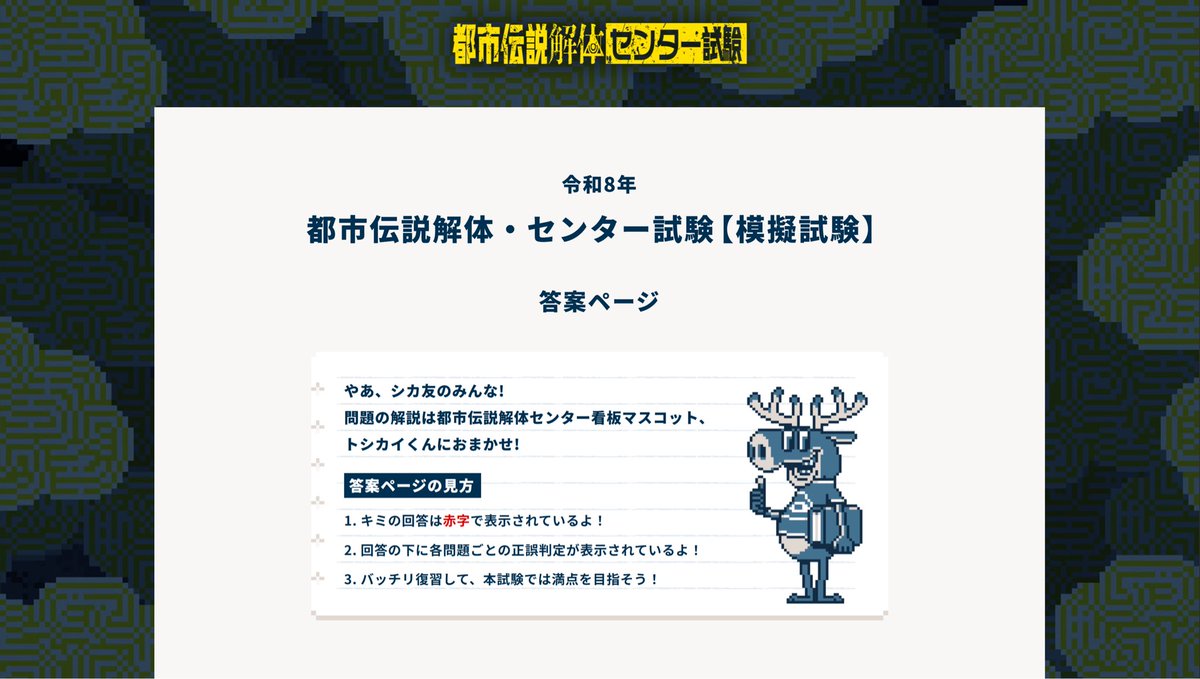 都市伝説解体・センター試験は、都市伝説を正しく読み解くための知識と調査方法を学ぶ試験制度です。本試験では調査員としての適性を判定し、認められた方には調査活動への参画をご案内いたします。