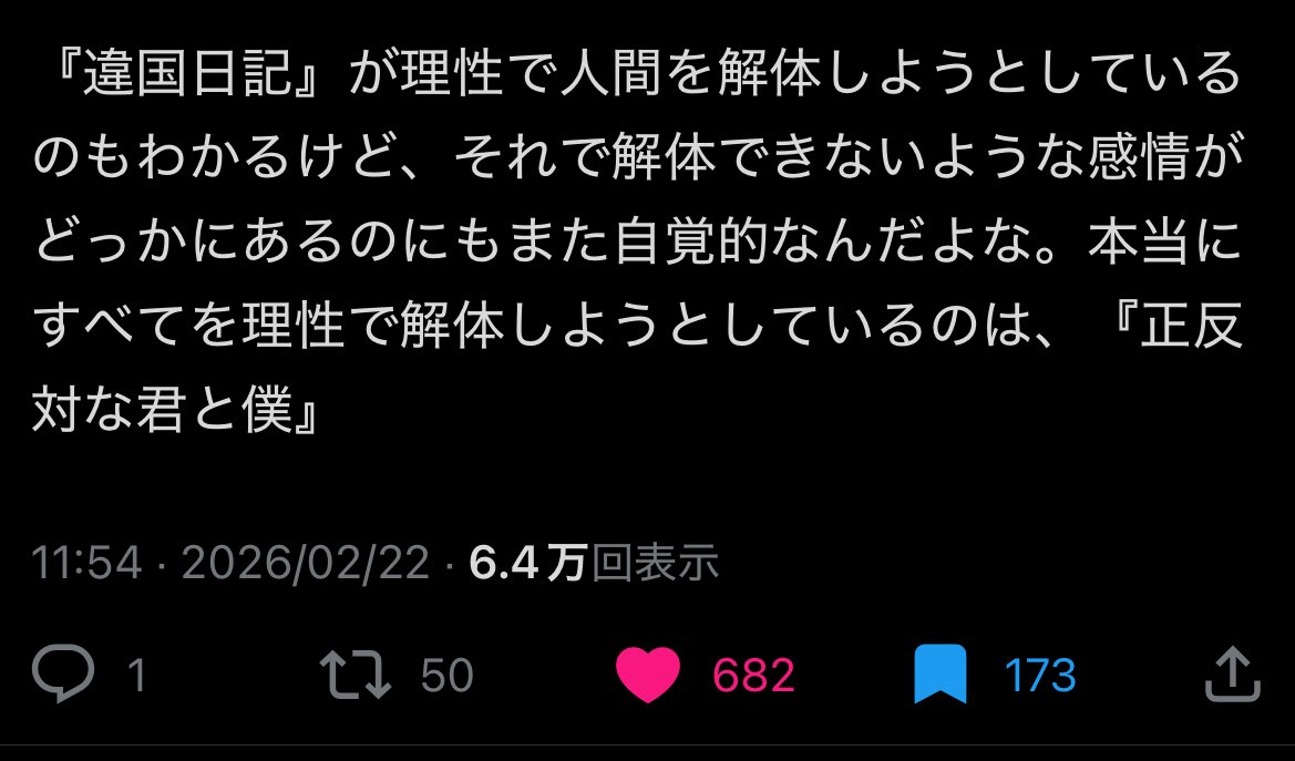 解体した先にある説明できないブラックボックスの話をしているのが違国日記で、正反対は全ての行動には合理的でこちらが解釈可能な解答があるという、傲慢な目線があるんだよね。平が自分で自分の感覚をルサンチマンに過ぎないと片付けたのは本当に悲しい展開だった。