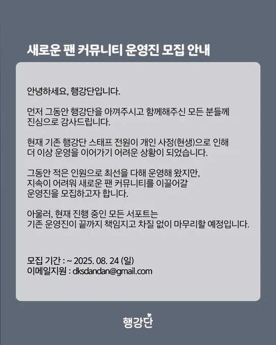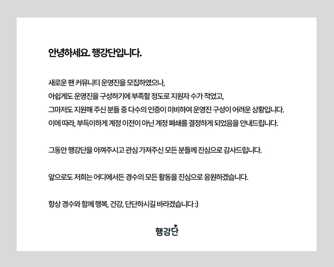 새로운 팬 커뮤니티 운영진을 모집하였으나, 아쉽게도 운영진을 구성하기에 부족할 정도로 지원자 수가 적었고 그마저도 지원해 주신 분들 중 다수의 인증 절차가 미비하여 운영진 구성이 어려운 상황입니다. 이에 따라, 부득이하게 계정 이전이 아닌 계정 폐쇄를 결정하게 되었음을 안내드립니다.