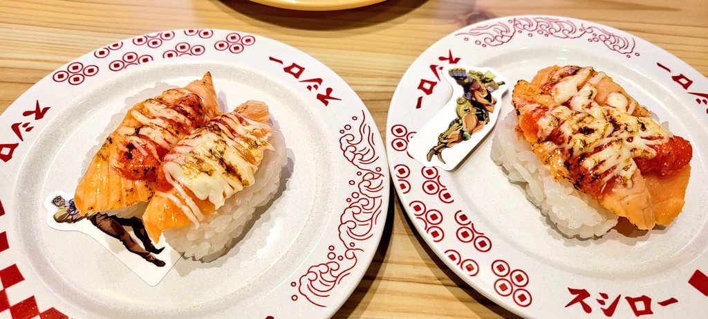 今日も懲りずに最後のスシロー×ジョジョの奇妙な冒険に行ってきたわ😂 ステッカー、イギー出んかったけどこれで終わりにします😌 ピックはコンプできたわ😂 1皿に3花京院典明ついてきた😂