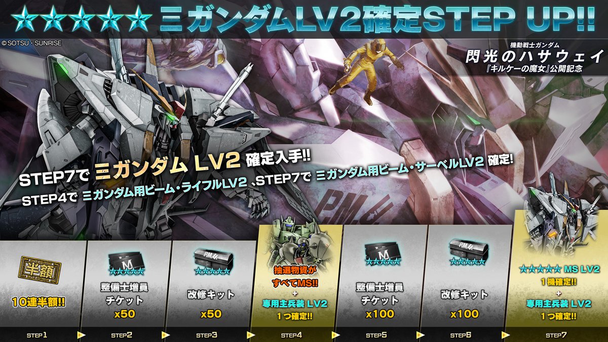本日より、「機動戦士ガンダム 閃光のハサウェイ キルケーの魔女」公開記念MS確定STEP UPを実施! すべてのSTEPで抽選物資がMS確定になる、特別なSTEP UP抽選配給となります。 ※抽選されるアイテムは通常の抽選配給と同じものになります。