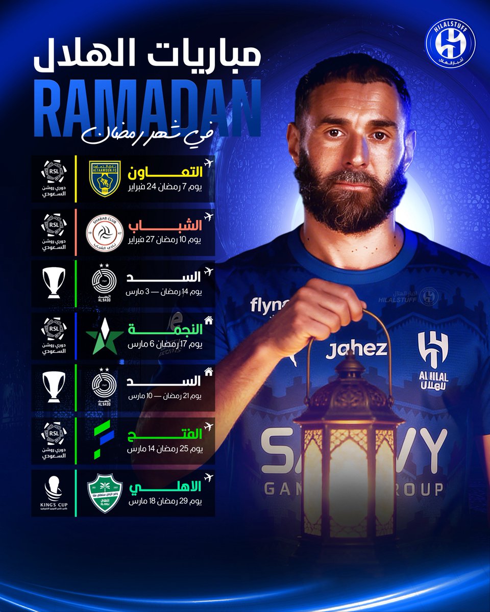 🚨 — جدول مباريات الهلال المتبقي في رمضان 🌙 ✈️ 7 رمضان — التعاون 🟡 ✈️ 10 رمضان — الشباب⚫️ ✈️ 14 رمضان — السد ⚫️ 🏠 17 رمضان — النجمة 🟢 🏠 21 رمضان — السد ⚫️ ✈️ 25 رمضان — الفتح 🔵 ✈️ 29 رمضان — الأهلي 🟢 كل 3 أيام مباراة 😰😰😰😰😰😰😰😰😰😰