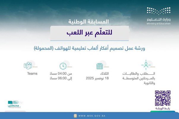 #تعليم_الطائف يعلن عن انطلاق مسابقة " التعلم عبر اللعب 2025-2026م" لطلبة المرحلتين المتوسطة والثانوية حيث تهدف هذه المسابقة إلى رعاية وتشجيع الابتكار في مجال الأدوات والمهارات الرقمية بالإضافة إلى تعزيز مهارات الإبداع، وحل المشكلات، والتفكير النقدي لدى الطلاب