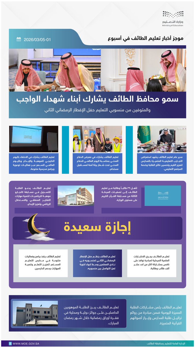 مدير عام #تعليم_الطائف يشهد استعراض التجارب التعليمية المتميزة، والتي تهدف إلى تعزيز القيم وتحسين نتائج الطلبة، وتخدم المجتمع التعليمي في المدارس، بحضور مديري المدارس. وهي تجربة مدرسة ورقة بن نوفل المتوسطة "حول تحسين الممارسات التدريسية" وتجربة متوسطة التحفيظ الأولى في "مبادرة نافس رحلة مجتمع" وذلك في إطار دعم العملية التعليمية وتمكين المدرسة وتشجيع الابتكار والإبداع في بيئة العمل المدرسي. مشيدًا بجهود مديري المدارس والهيئتين الإدارية والتعليمية وتعاون أولياء الأمور.