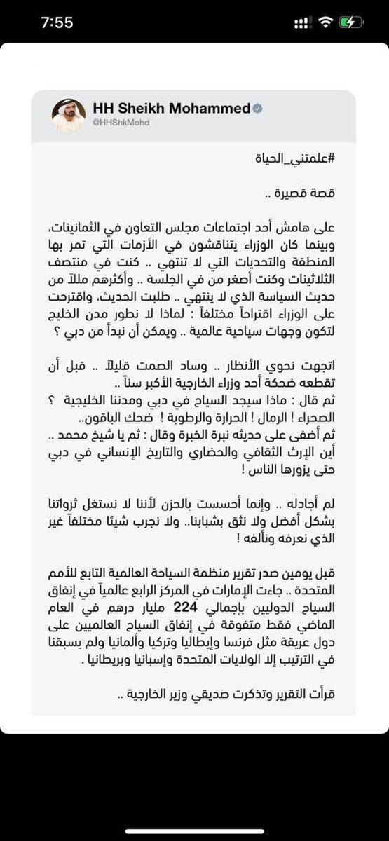 على هامش أحد اجتماعات مجلس التعاون في الثمانينات، وبينما كان الوزراء يتناقشون في الأزمات التي تمر بها المنطقة والتحديات التي لا تنتهي .. كنت في منتصف الثلاثينات وكنت أصغر من في الجلسة .. وأكثرهم مللاً من حديث السياسة الذي لا ينتهي .. طلبت الحديث، واقترحت على الوزراء اقتراحاً مختلفاً : لماذا لا نطور مدن الخليج لتكون وجهات سياحية عالمية .. ويمكن أن نبدأ من دبي ؟