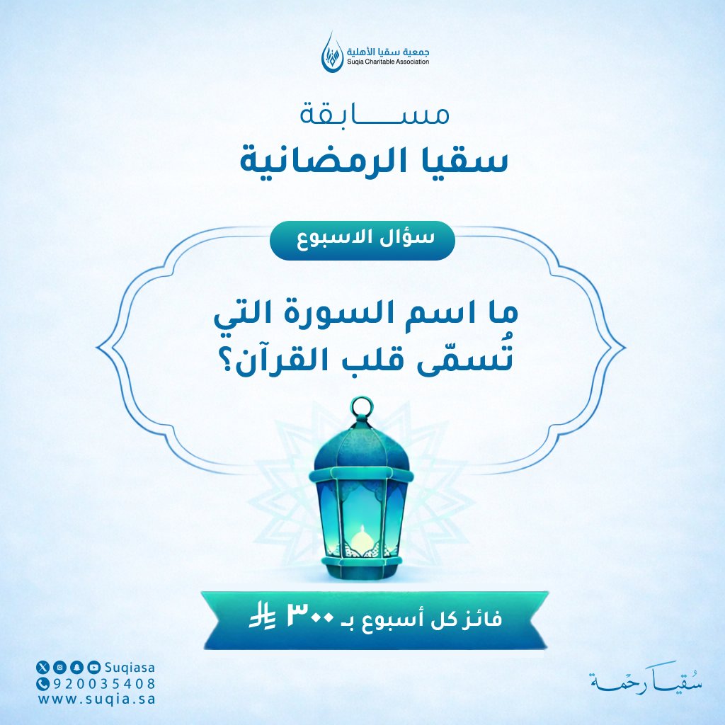 السؤال الأول ❔ شروط المشاركة في المسابقة: متابعة حساب الجمعية إضافة هاشتاق #مسابقة_سقيا_الرمضانية في الرد إضافة هاشتاق #سقيا_رحمة في الرد الرد بإجابة صحيحة على هذه التغريدة 🎁 يتم السحب على الفائز مساء يوم الخميس 🎉
