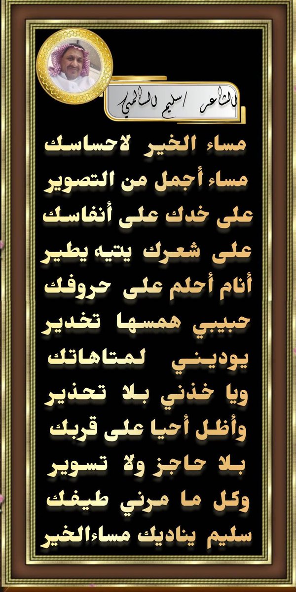 #مساء_الخير أحــلا ترانيم الشعـر وأحـلا مسـاء وأجمـل تحيات الغلا وأجمل ســلام لكـل مـن يتابعنـي فـي هـالمســاء لـه الحـب والمـوده وأحـلا مقــام