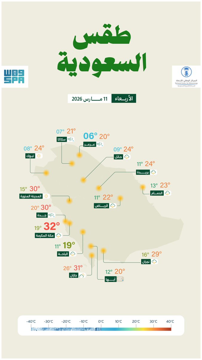 #الأرصاد: توقعات هطول أمطار رعدية متوسطة إلى غزيرة تؤدي لجريان السيول مصحوبة بزخات من البرد ورياح نشطة على عسير، الباحة ومكة المكرمة تمتد إلى المدينة المنورة كذلك على حائل، القصيم، الرياض، الشرقية والحدود الشمالية، وتكون خفيفة إلى متوسطة على جازان ونجران مع تكون الضباب.