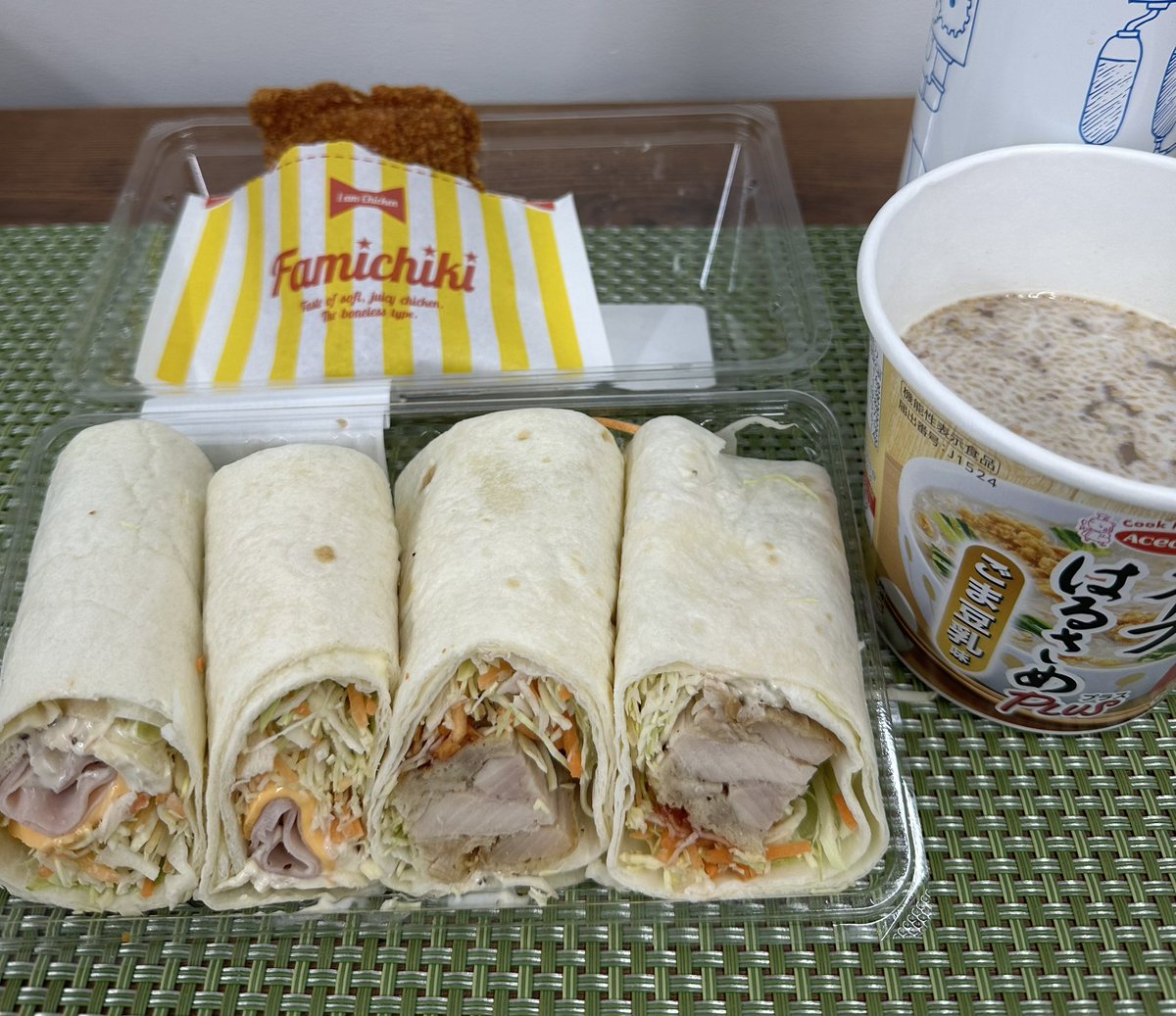 今日のおにぎり🍙 ファミマのトルティーヤ(ハムチーズ、フライドチキン)、ファミチキレッド、はるさめスープ(ごま豆乳) あ、チキン被りだwww