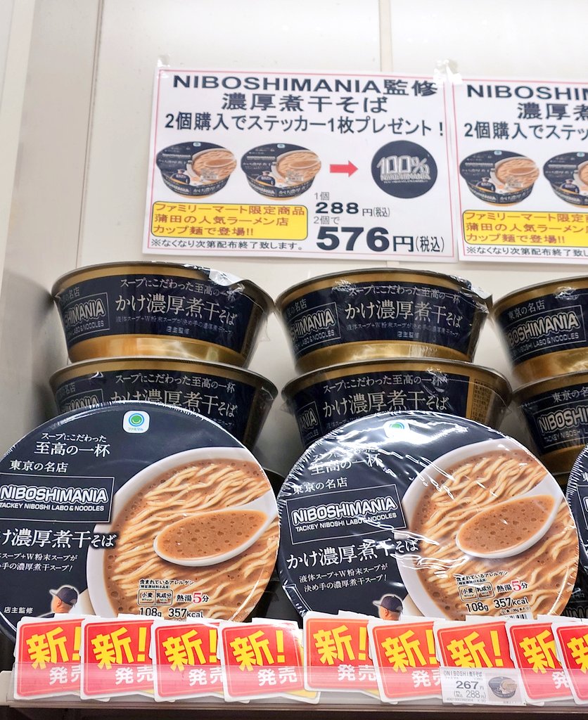 NIBOSHIMANIA監修、濃厚煮干そばのカップ麺キターーー!!! ファミマ限定、2個購入でステッカーw 蒲田民として、2個買いました!!