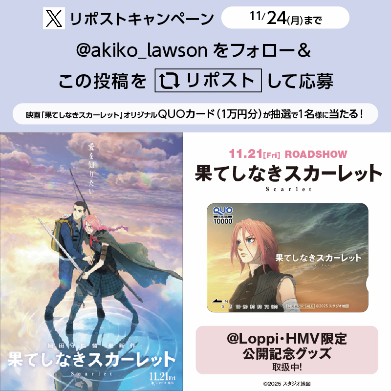 11/21公開 映画『果てしなきスカーレット』リポストキャンペーン♪ @akiko_lawson をフォローし、この投稿をリポストしてくれた方から抽選で1名様に映画オリジナルQUOカード1万円分をプレゼント(^^) lawson.co.jp/lab/entertainme…