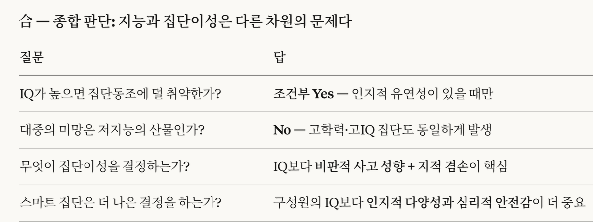 지능은 오히려 더 정교한 합리화 도구로 전용될 수 있다는 점에서, 대중의 미망을 막는 열쇠는 IQ보다는 "내가 틀릴 수 있다"는 태도에 있다고 보는 것이 현재 인지과학의 컨센서스다.