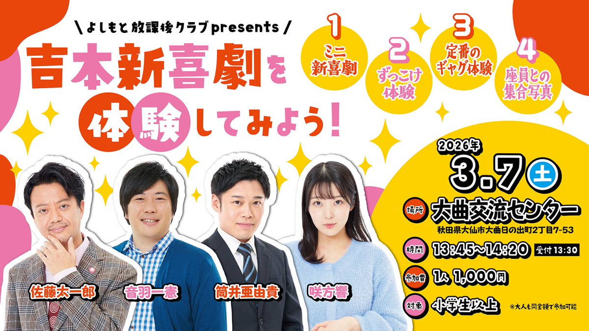 ╔═══════════════╗ 3/7(土)出前ツアー秋田公演 ワークショップ開催決定📣 ╚═══════════════╝ 秋田の皆さーん! 新喜劇座員とずっこけ体験しませんか?🥳🥳 《よしもと放課後クラブpresents吉本新喜劇を体験してみよう!》 📅実施日時:3/7(土) 13:30受付開始、13:45〜14:20本番 📍会場: