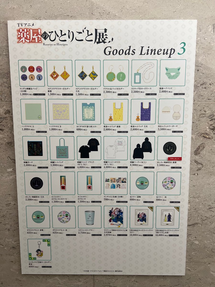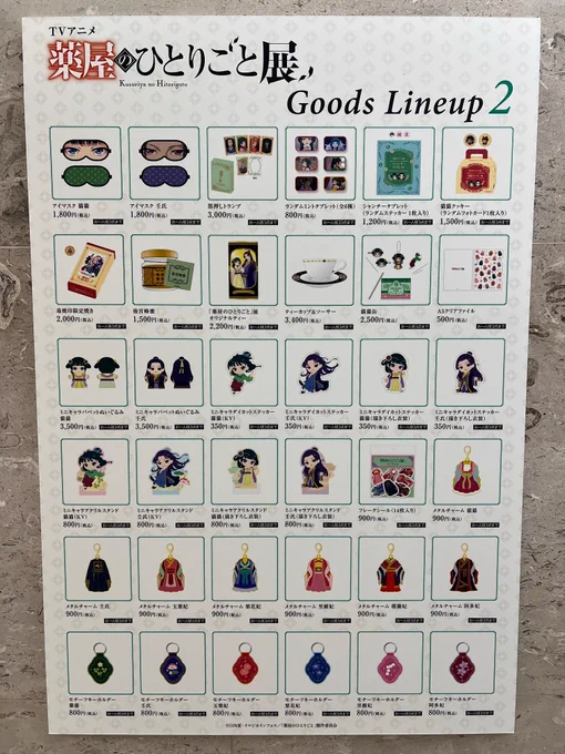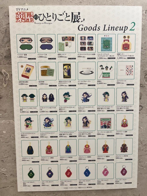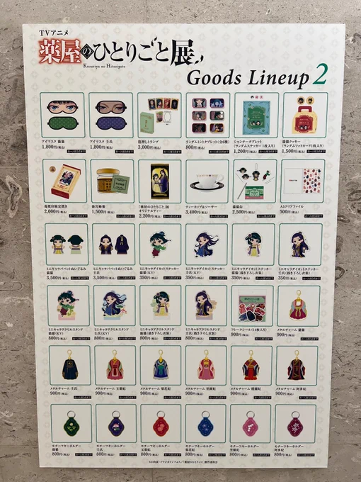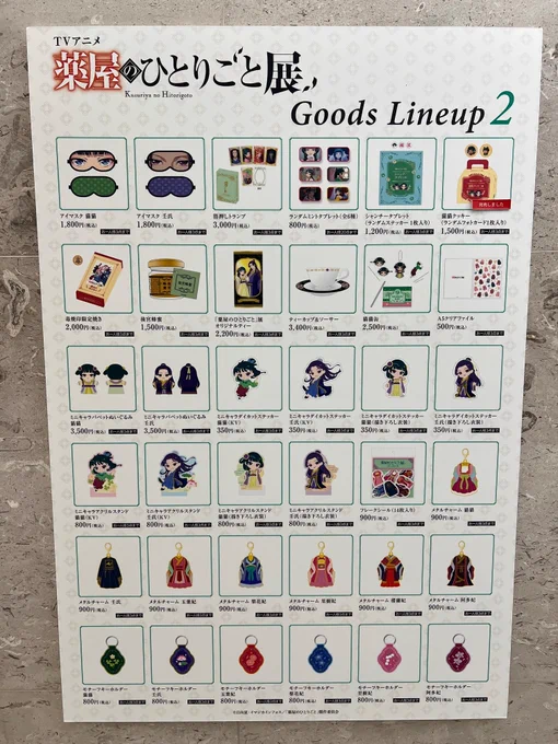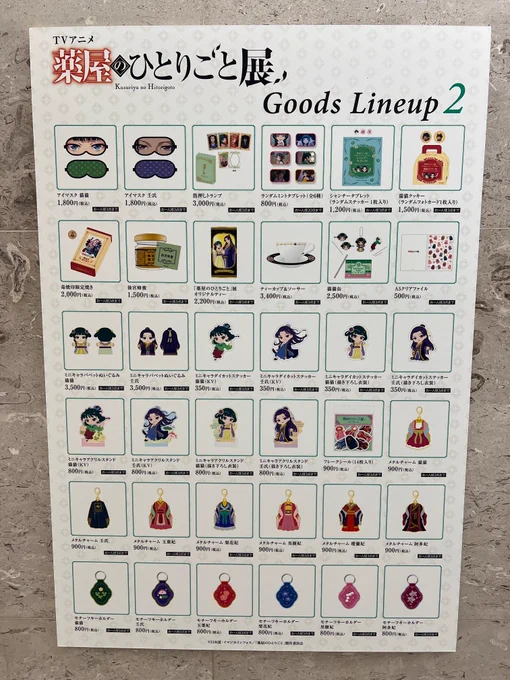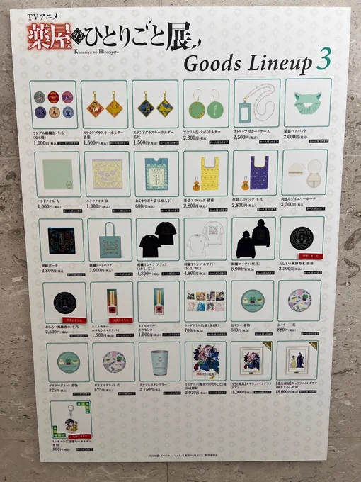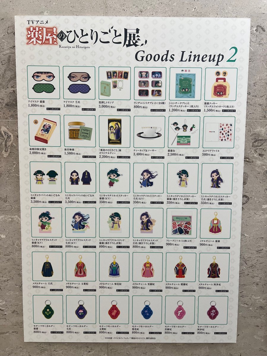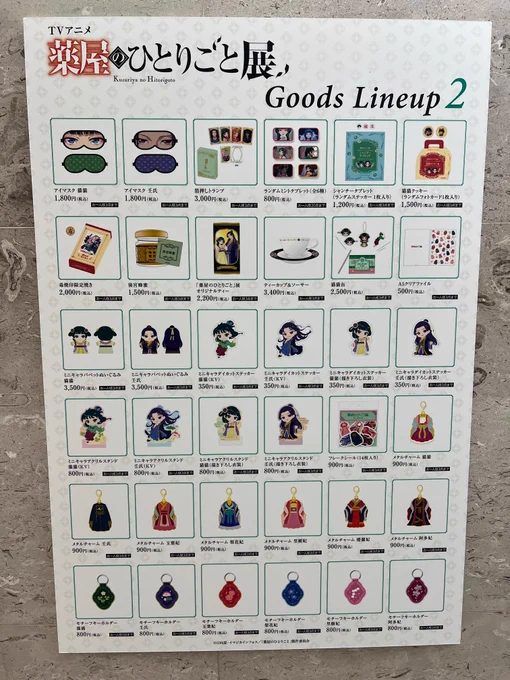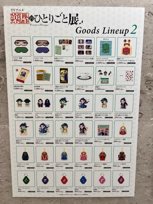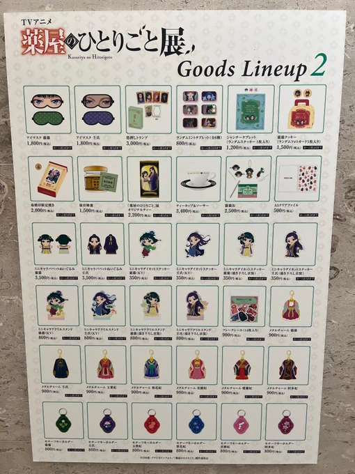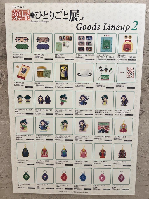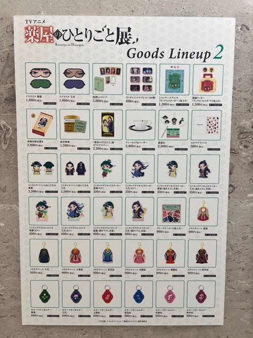 TVアニメ『薬屋のひとりごと』展 愛知会場 【グッズ完売情報】 11月14日 14:00時点 画像をご確認ください。 *展覧会オリジナル商品は各日在庫をご用意し、販売しております。 完売次第その日の在庫は終了となります。 *翌日の開場時には新たに納品し販売する予定です。 その他諸情報につきましては、公式Webサイトをご確認ください。 公式Webサイトはこちら▽
