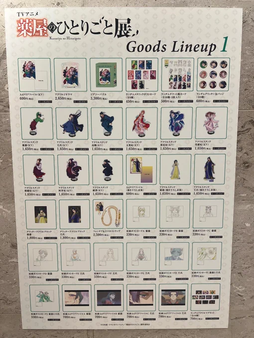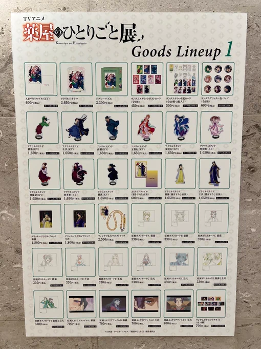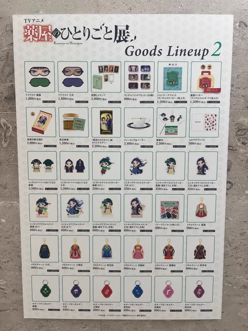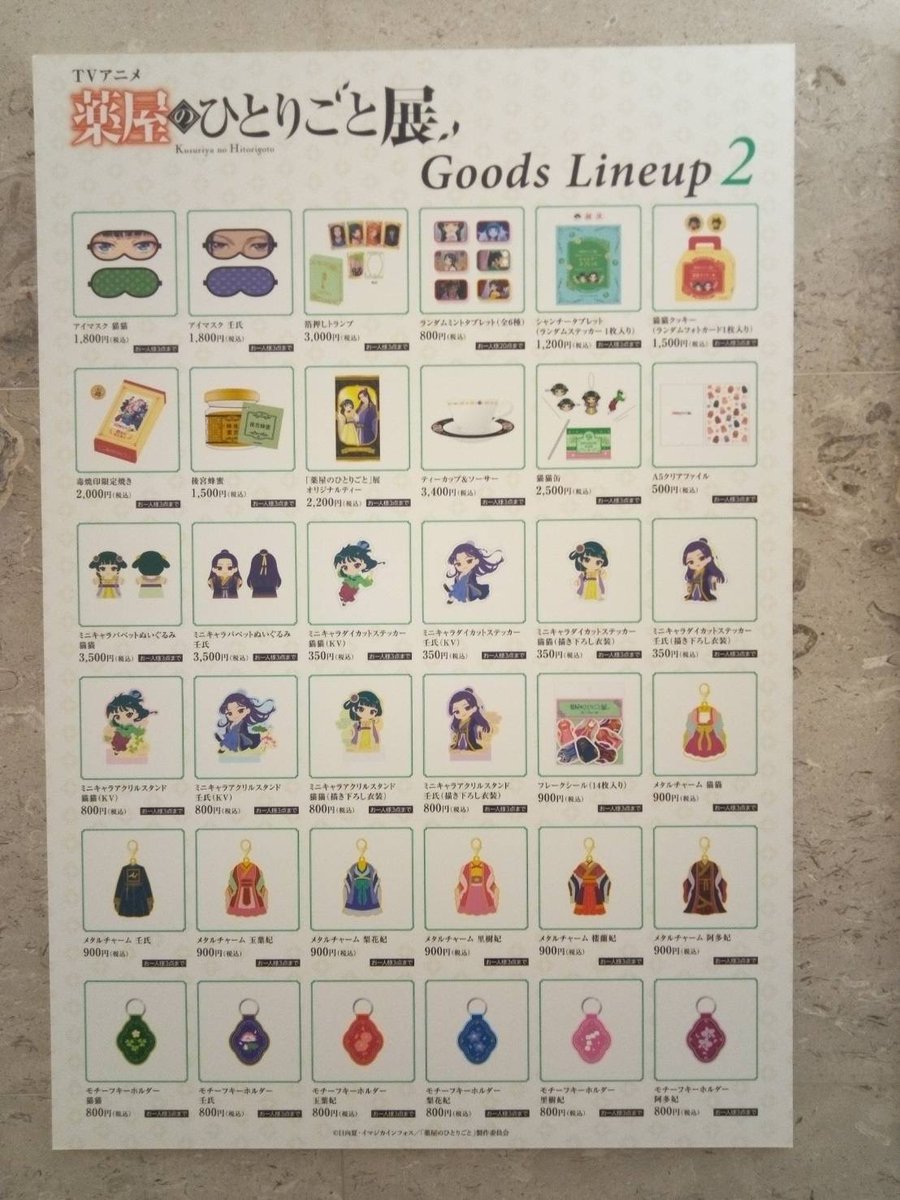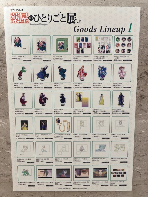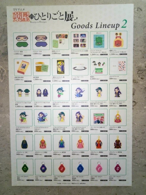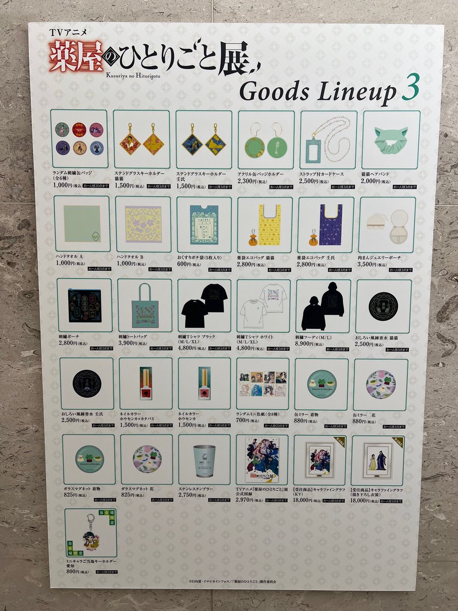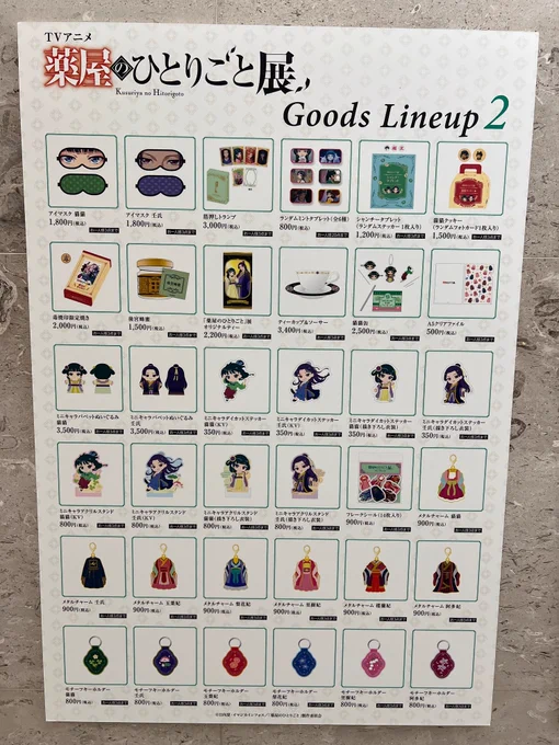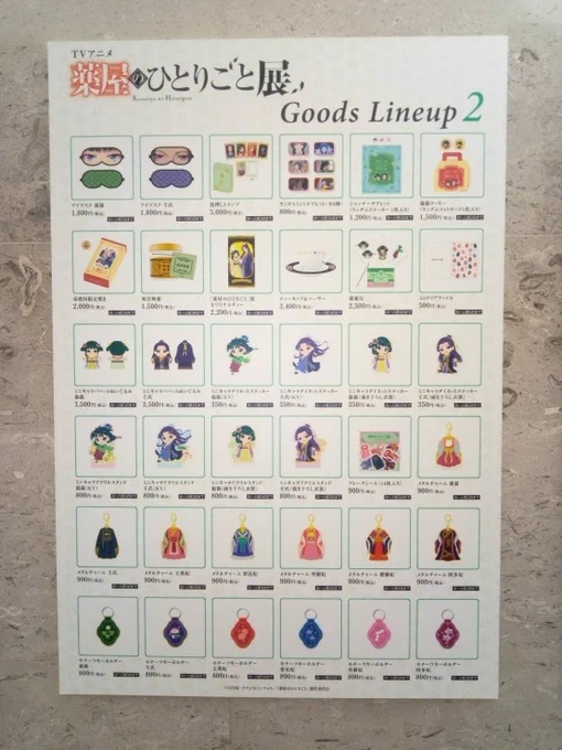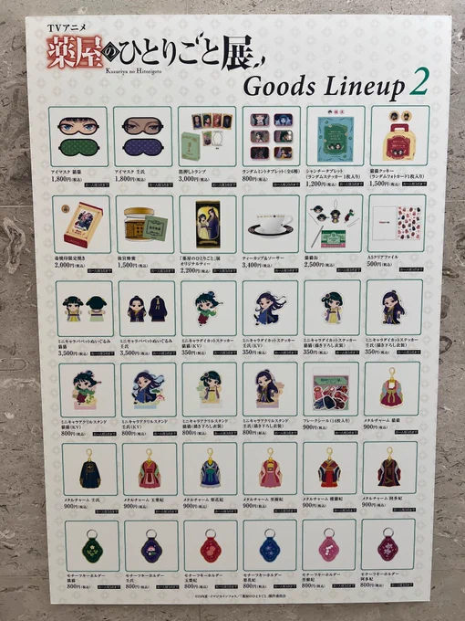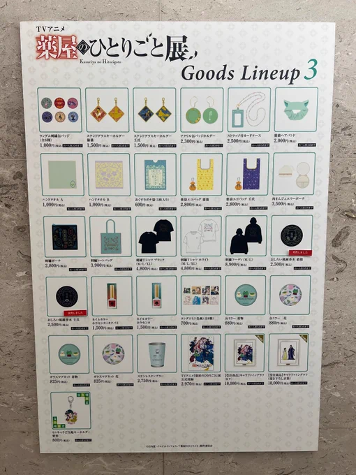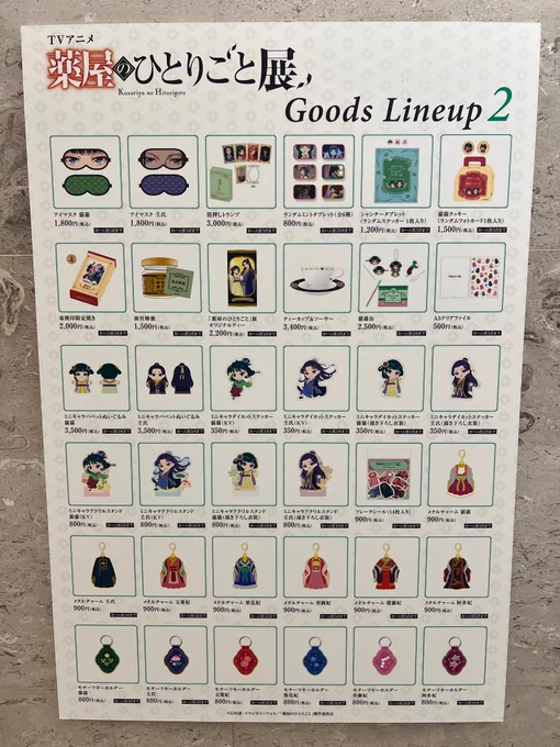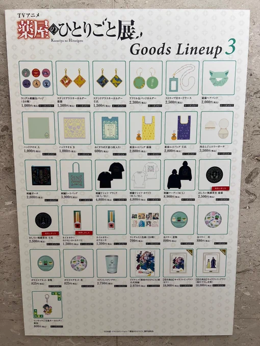 TVアニメ『薬屋のひとりごと』展 愛知会場 【グッズ完売情報】 11月14日 14:00時点 画像をご確認ください。 *展覧会オリジナル商品は各日在庫をご用意し、販売しております。 完売次第その日の在庫は終了となります。 *翌日の開場時には新たに納品し販売する予定です。 その他諸情報につきましては、公式Webサイトをご確認ください。 公式Webサイトはこちら▽