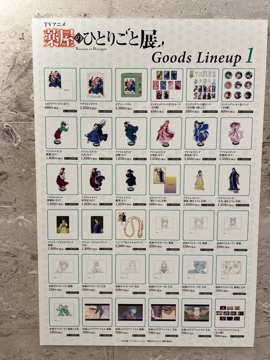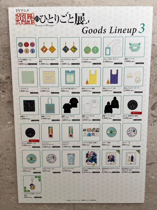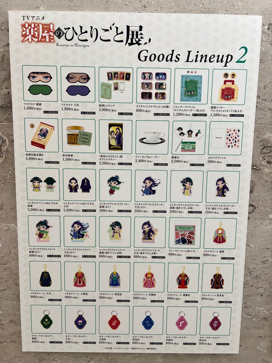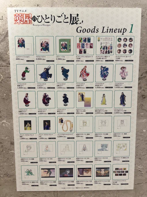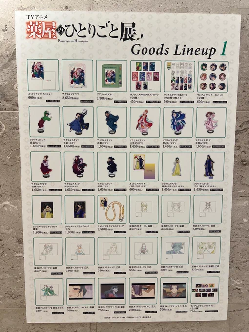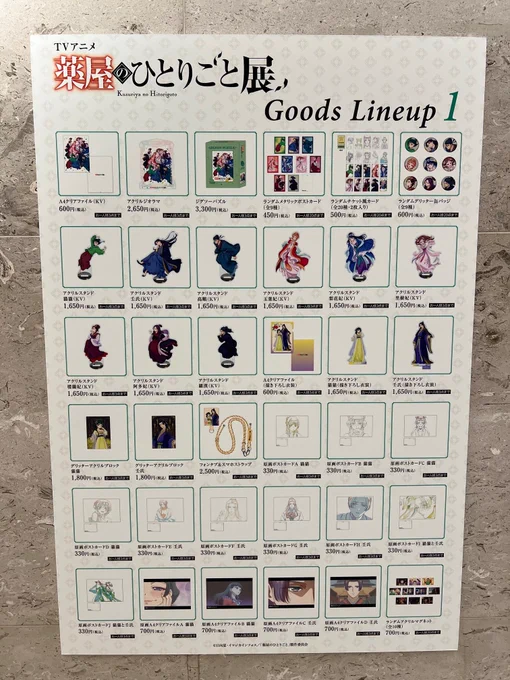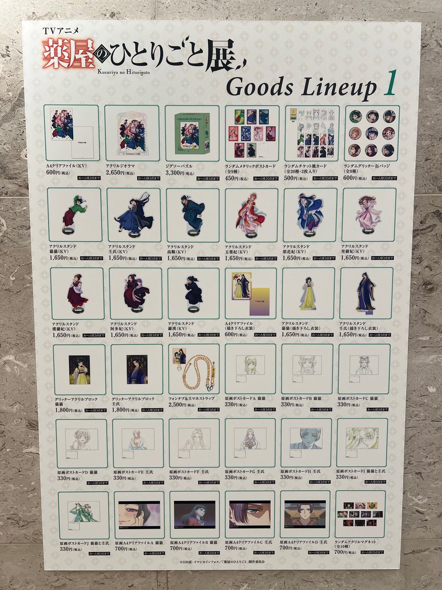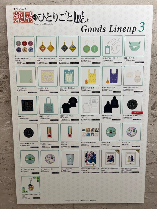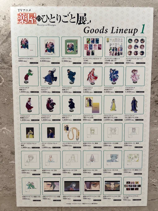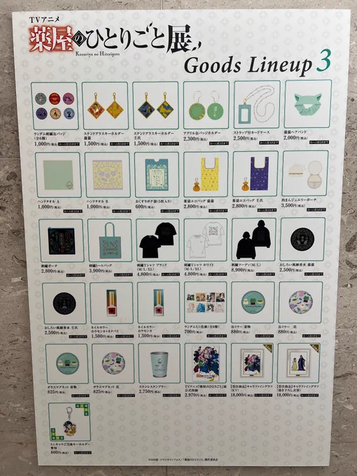 TVアニメ『薬屋のひとりごと』展 愛知会場 【グッズ完売情報】 11月14日 14:00時点 画像をご確認ください。 *展覧会オリジナル商品は各日在庫をご用意し、販売しております。 完売次第その日の在庫は終了となります。 *翌日の開場時には新たに納品し販売する予定です。 その他諸情報につきましては、公式Webサイトをご確認ください。 公式Webサイトはこちら▽