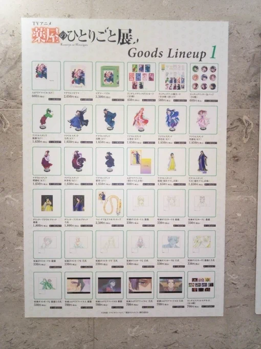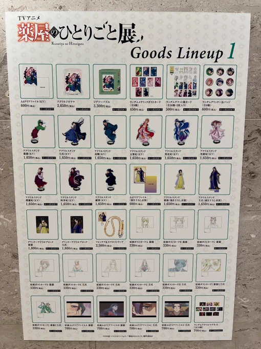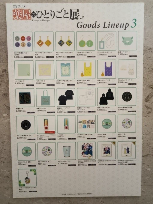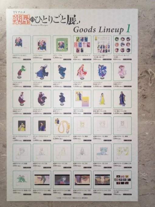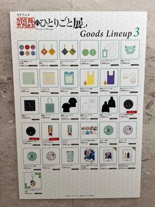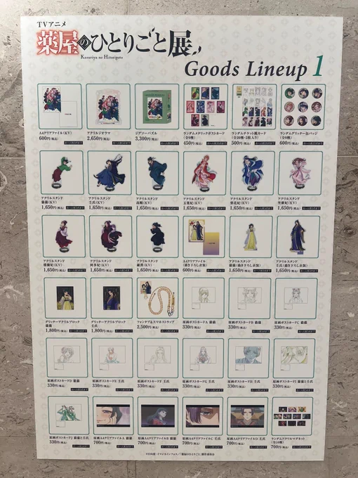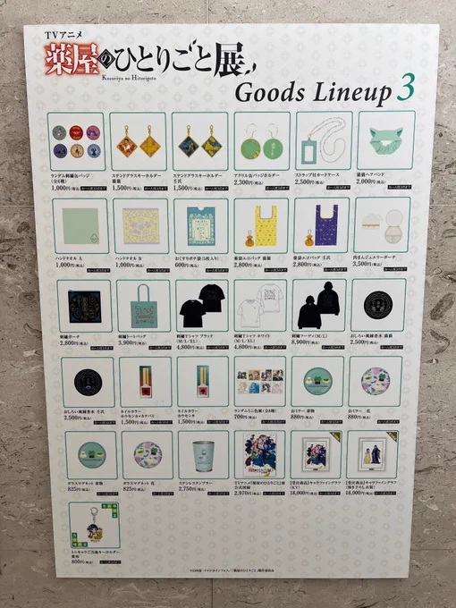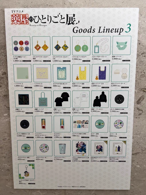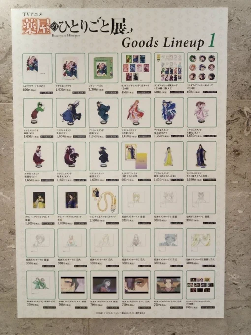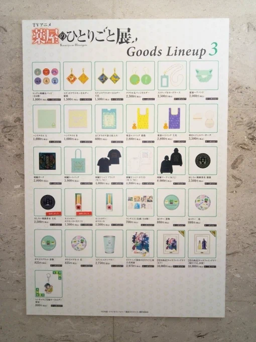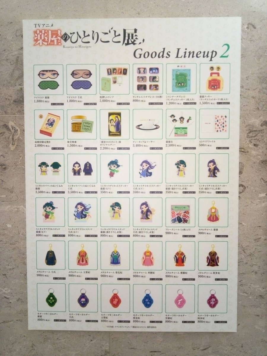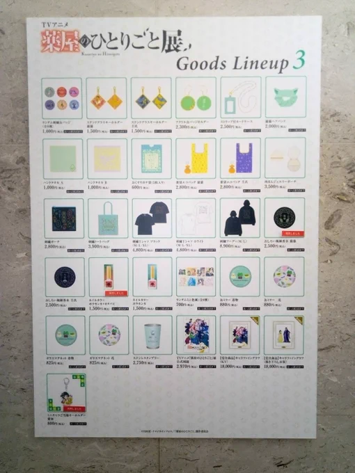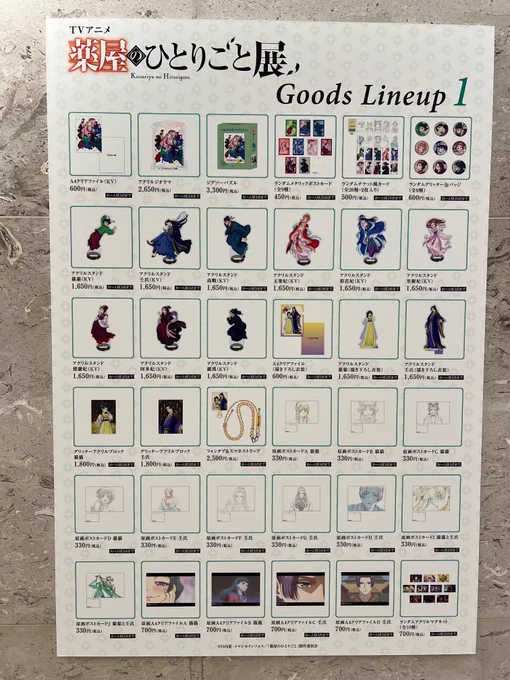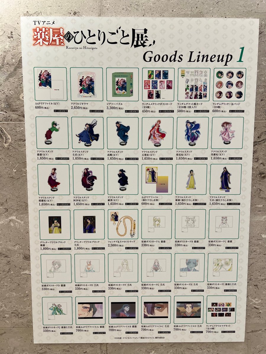 TVアニメ『薬屋のひとりごと』展 愛知会場 【グッズ完売情報】 11月14日 14:00時点 画像をご確認ください。 *展覧会オリジナル商品は各日在庫をご用意し、販売しております。 完売次第その日の在庫は終了となります。 *翌日の開場時には新たに納品し販売する予定です。 その他諸情報につきましては、公式Webサイトをご確認ください。 公式Webサイトはこちら▽