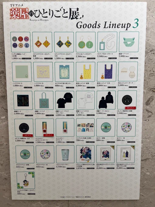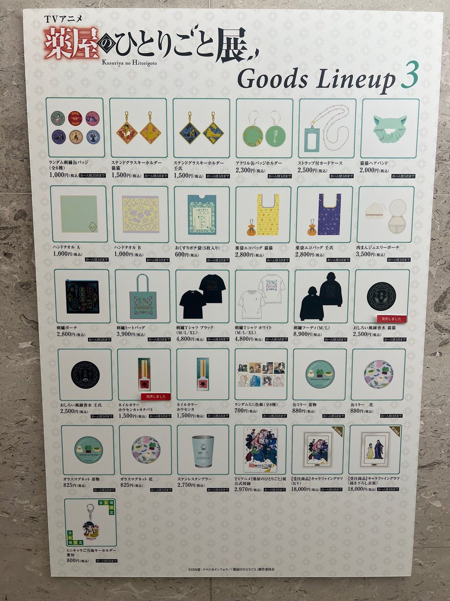 TVアニメ『薬屋のひとりごと』展 愛知会場 【グッズ完売情報】 11月7日 14:00時点 画像をご確認ください。 *展覧会オリジナル商品は各日在庫をご用意し、販売しております。 完売次第その日の在庫は終了となります。 *翌日の開場時には新たに納品し販売する予定です。 その他諸情報につきましては、公式Webサイトをご確認ください。 公式Webサイトはこちら▽
