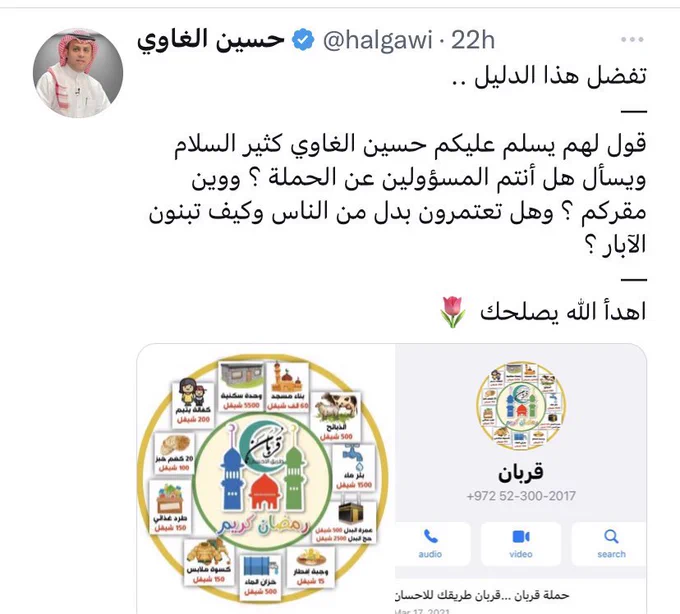﷽ لَولا إِذ سَمِعتُموهُ ظَنَّ المُؤمِنونَ وَالمُؤمِناتُ بِأَنفُسِهِم خَيرًا وَقالوا هذا إِفكٌ مُبينٌ بالنسبة لبعض الحسابات التي نشرت مقطعًا وأنا أدعو لأحد الأوقاف وزعمت أني منهم؛ فالقصة باختصار قبل سنوات عديدة كنت بتركيا مع الوالدة حفظها الله ونازل من الفندق بلبس الطلعة وواضح من التصوير أنه تصوير هاتف ومركب وأني مختلف عن بقية الموجودين -حتى باللباس غير مهيأ-، وأتى إليَّ شباب من فلسطين ويظهر عليهم الصلاح بهيئتهم وأحسنت فيهم الظن وقالوا : نحن وقف يدعم الأيتام والقدس المحتلة وغزة، وطلبوا مني دعاء للوقف بالتوفيق والسداد. وهذا ما فعلته بحسن نية -ولم أدع إلى أي تبرع، بل كل تاريخي في الدعوة للتبرع يكون عبر مؤسساتنا الرسمية وحدها- وأي مسلم إذا رأى مشروعًا يخدم الضعفاء والأيتام والمكلومين فمن الطبيعي أن يدعو بالخير ويحسن الظن ! وليس لي أي صلة ولا انتماء لوقف الأمة ولا للإخوان المسلمين ولا لأي جماعات وأحزاب أو تيارات وتنظيمات مخالفة، وأنا ولله الحمد مسلم على الكتاب والسنة -بمنهج سلف الأمة- وتخرجت من المدينة المنورة ومشايخي معروفون ليسوا أصحاب أحزاب وتنظيمات وجماعات ومظاهرات، أما بالنسبة لمن ثبت عليهم السرقة فليقدم الأدلة للسلطات الرسمية -ويجب معاقبة المجرمين ولابد من محاسبتهم-( وليس تشويه سمعة من دعا بالتوفيق والسداد بموقف عابر ! ) ويقول ﷺ : من قال في مؤمنٍ ما ليس فيه أسكنه اللهُ رَدْغَةَ الخَبالِ حتَّى يخرُجَ ممَّا قال . ويقول ﷺ : إيَّاكُمْ والظَّنَّ، فإنَّ الظَّنَّ أكْذَبُ الحَديثِ، ولا تَحَسَّسُوا، ولا تَجَسَّسُوا، ولا تَنافَسُوا، ولا تَحاسَدُوا، ولا تَباغَضُوا، ولا تَدابَرُوا، وكُونُوا عِبادَ اللهِ إخْوانًا. اللهم خلقنا بأخلاق القرآن واجعلنا هداة مهتدين لا ضالين ولا مضلين ولا مبدلين أحمد بن عبدالعزيز النفيس ٢٦ جمادى الأولى ١٤٤٧ هـ ١٧ نوفمبر ٢٠٢٥ م