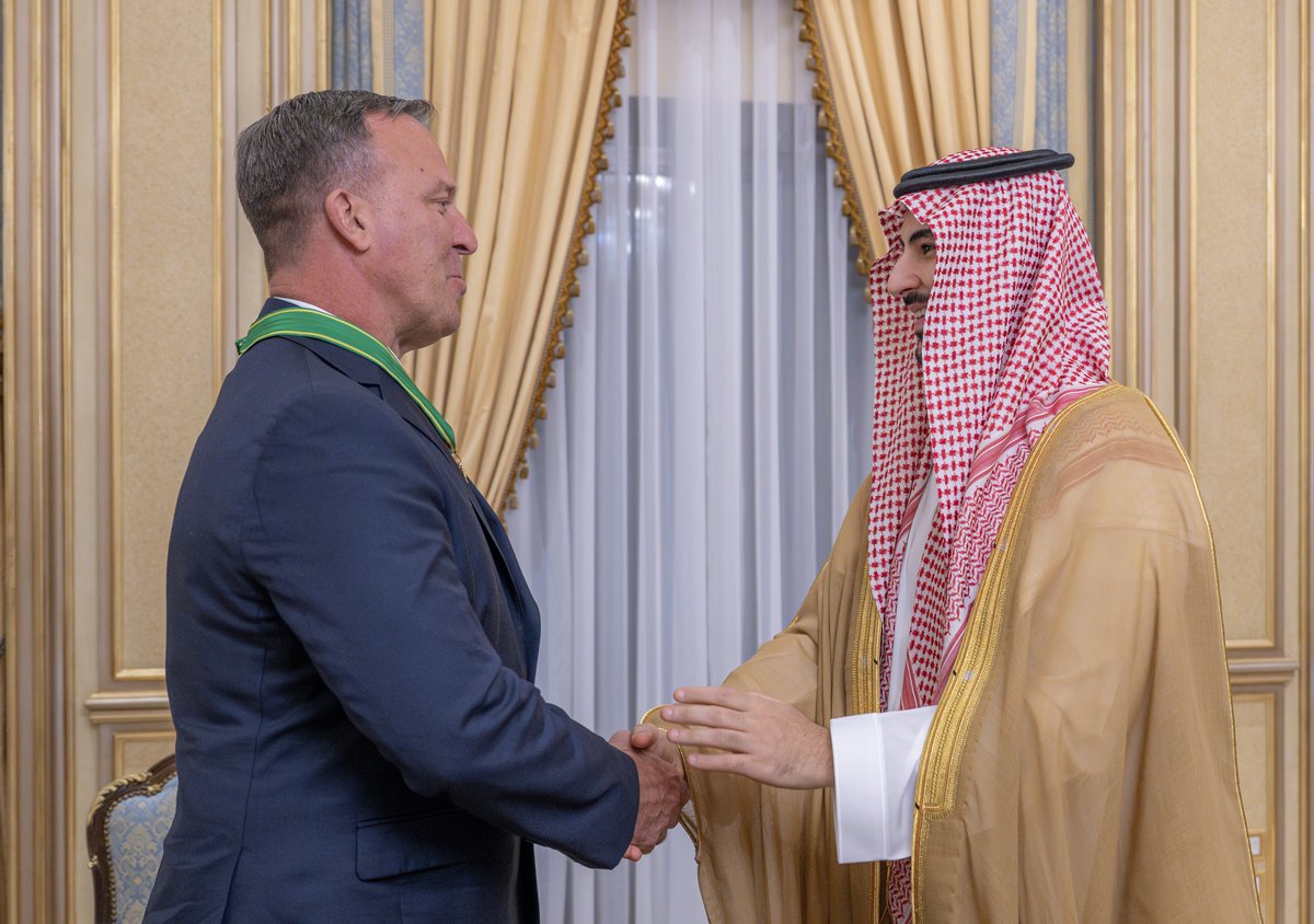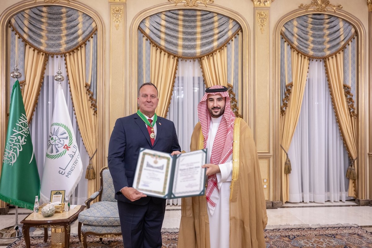إنفاذًا لأمر سيدي خادم الحرمين الشريفين -حفظه الله-، قلّدتُ معالي قائد القيادة المركزية الأمريكية السابق الفريق الأول المتقاعد مايكل كوريلا، وسام الملك عبدالعزيز من الدرجة الممتازة.