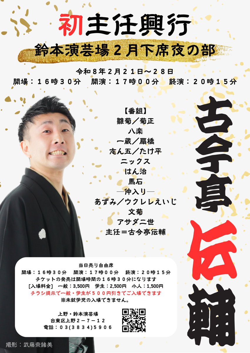 🗣️:古今亭伝輔さん初主任興行 🗓️:2/21(本日!)〜2/28 ⏰️:開場16:30 開演17:30 📍:鈴本演芸場 東京都台東区上野2-7-12 🎫:大人3500円(当日販売のみ)