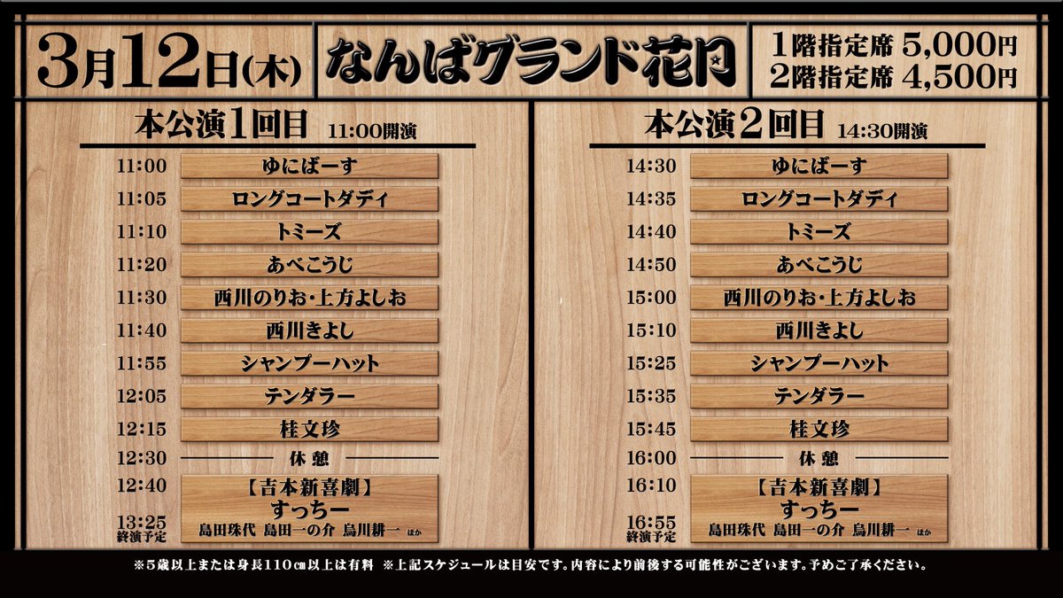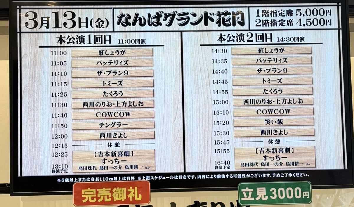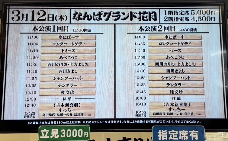 ˗ˏˋ なんばグランド花月 ˎˊ˗ \本日3/12の券売状況/ 11:00〜 ①回目 立見あり🔺 14:30〜②回目 お席あり⭕️