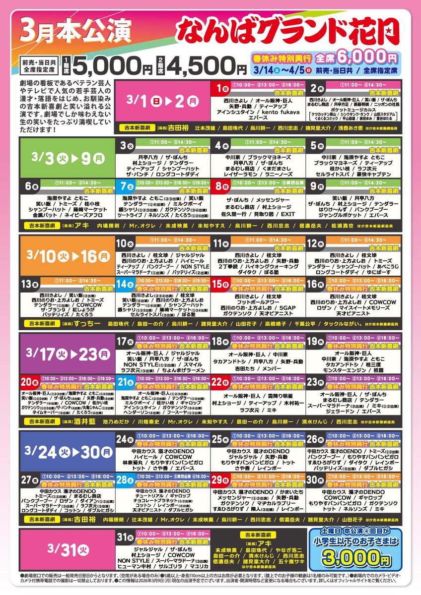 ˗ˏˋ なんばグランド花月 ˎˊ˗ \本日3/11の券売状況/ 11:00〜 ①回目 お席あり⭕️ 14:30〜②回目 お席あり⭕️ 19:00〜19時ライブ~よくばり!MIX!~お席あり⭕️