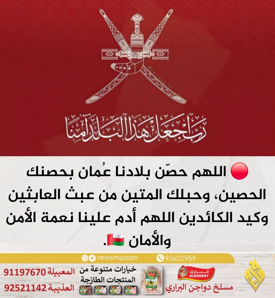 🔴 اللهم حصّن بلادنا عُمان بحصنك الحصين، وحبلك المتين من عبث العابثين وكيد الكائدين اللهم أدم علينا نعمة الأمن والأمان 🇴🇲.