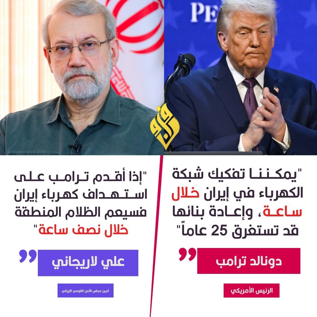 🔴 علي لاريجاني: إذا أقدم ترمب على استهداف كهرباء إيران فسيعم الظلام المنطقة خلال نصف ساعة.