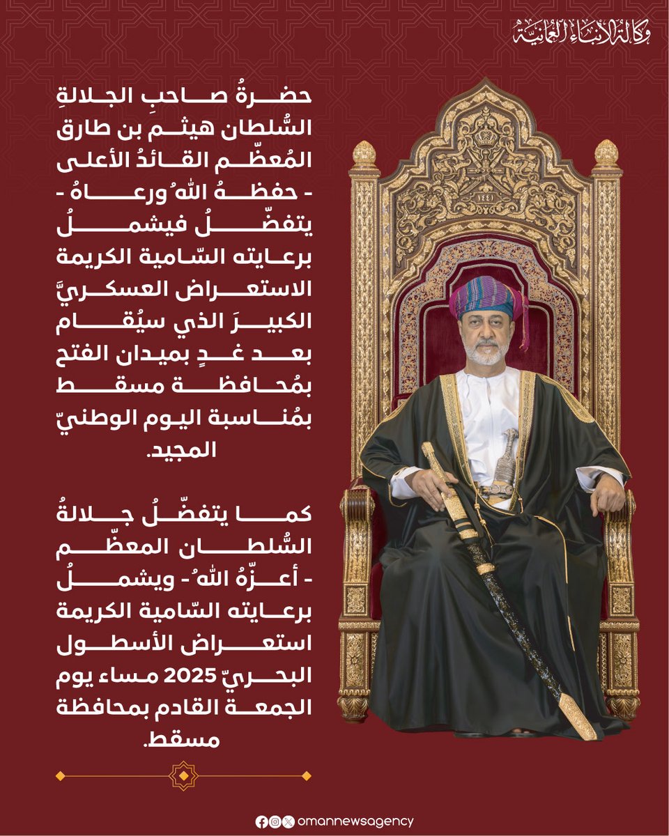 جلالةُ السُّلطان #هيثم_بن_طارق المعظّم حفظه الله ورعاه تفضّل بمنح وسام الإشادة السلطانية من الدرجة الثانية لعدد من أصحاب الفضيلة والسعادة تقديرًا لجهودهم المخلصة، وتزامنًا مع احتفالات اليوم الوطني المجيد
