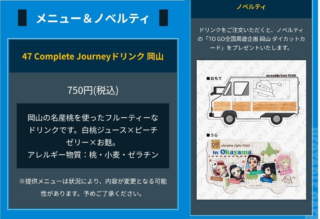 【代行】鬼滅の刃 TOGO2 岡山 限定ドリンク 譲) 岡山限定ドリンク、ノベルティカード 求) 750円+送料 ・相互FF様のみ ・今後のTOGO2で当選した際に同様に代行のご協力頂けると助かります ・22日(日)午後当選済 ・現地の方は現金、後日郵送の方はゆうちょ、三菱東京UFJ対応 22日 12:00 〆切